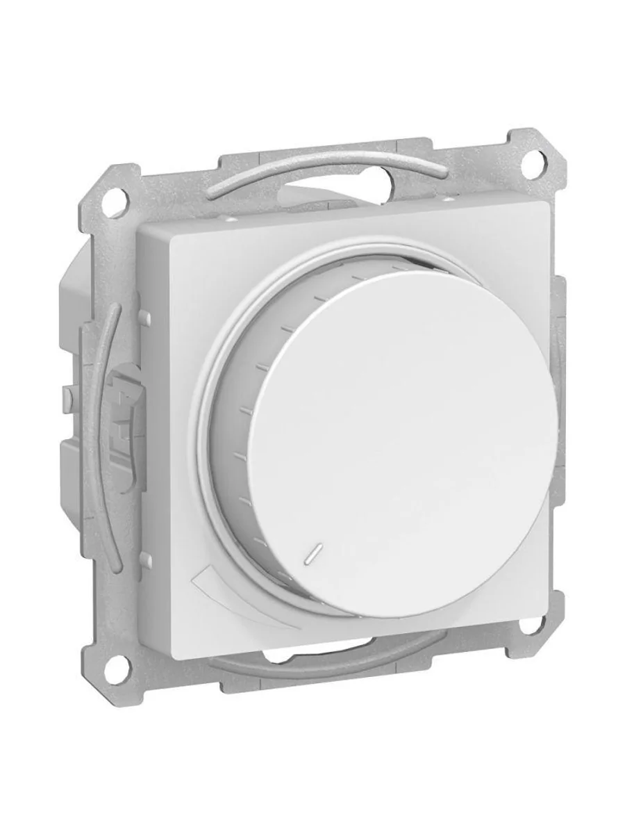 Механизм светорегулятора Systeme Electric серии AtlasDesign (цвет белый) поворотно-нажимной для нагрузки мощностью до 400 Вт, подходит для LED ламп. - Светорегулятор позволяет установить в помещении комфортный уровень освещения. - При подключении второго переключателя диммер может использоваться как проходной переключатель. - Может использоваться как выключатель или переключатель. - Выполнен из материала, стойкого к УФ-излучению и появлению царапин (ранее Schneider Electric ATN000134, ATN000136, MGU5.511.18ZD, NU551418, S52R512).