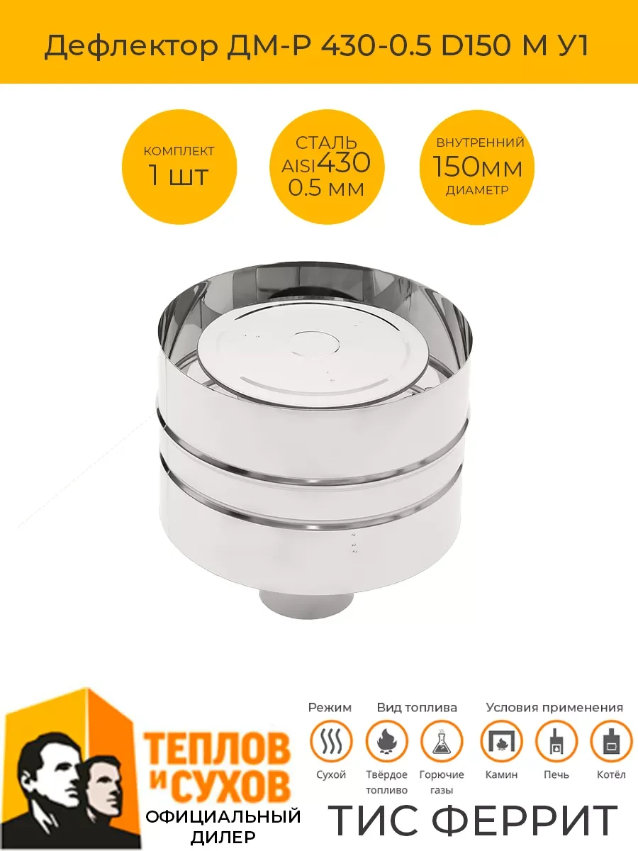 ДАННЫЙ ТОВАР ГАРАНТИРОВАННО СТЫКУЕТСЯ ТОЛЬКО С ПРОДУКЦИЕЙ ТЕПЛОВ И СУХОВ.Дефлекторы устанавливаются на окончание дымовой трубы и выполняют функцию усилителя тяги при сильном боковом ветре, защищают дымоход от попадания атмосферных осадков. Дефлекторы используются во избежание ветрового запирания устья дымоходов при возникновении сильных ветровых нагрузок, вследствие аэродинамических условий, обусловленных геометрией кровли и другими возможными причинами. Дефлектор состоит из участка трубы, расположенного над ним экрана (зонта) для защиты канала дымохода от атмосферных осадков и экранирующего цилиндра большего диаметра, защищающего от ветровых потоков.