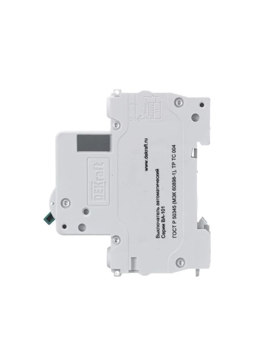 Автоматический выключатель серии ВА-101 Dekraft; 1P; номинальный ток 50 А; характеристика С; отключающая способность 4,5 кА. 5 монолитных заклепок повышают прочность корпуса аппарата. Сплошная лицевая панель обеспечивает безопасность эксплуатации аппарата. Боковые каналы охлаждения повышают стабильность работы при высоких температурах окружающей среды. Есть возможность установки дополнительных аксессуаров с левой стороны устройства. Аппарат на 100% совместим с корпусами Dekraft и Systeme Electric.
