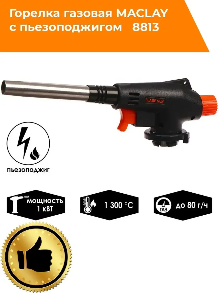Газовая горелка Maclay 8813 используется в быту для ремонтных и хозяйственных работ, а также для приготовления пищи в походных условиях.Чтобы собрать всю конструкцию, прикрепите к портативной насадке баллон с газом.ХарактеристикиРасход газа: до 80 г/часМощность: 1,0 кВтТемпература горения: 1300 °СПодача газа регулируетсяПодходит цанговый баллон (не входит в комплект)Внимание! При работе прибора некоторые части могут сильно нагреваться. Не используйте прибор в непосредственной близости с местами, где находятся легковоспламеняющиеся предметы (бензин, газ, спички, бумага и т.п.).