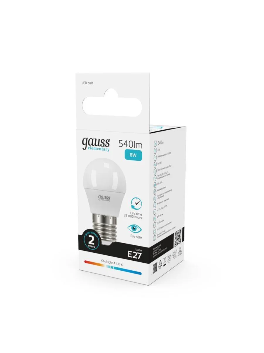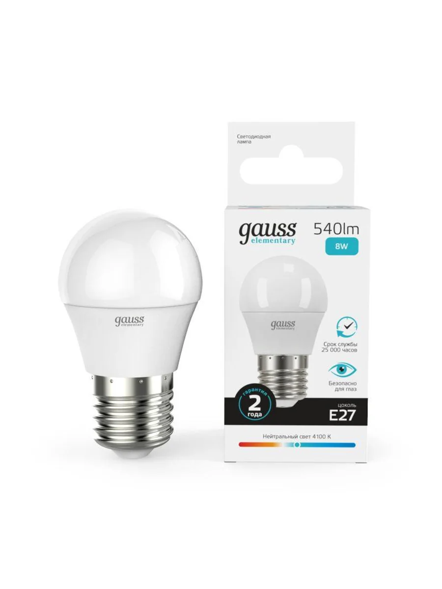 Лампа светодиодная Elementary 8Вт P45 шар 4100К нейтр. бел. E27 540лм GAUSS 53228 - купить в KeepBuilding | KeepBuilding