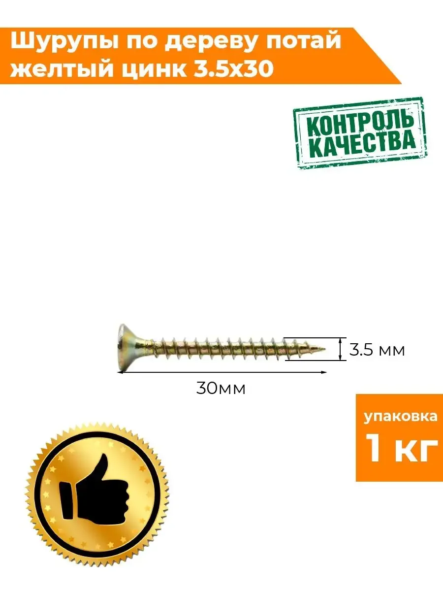 Шурупы по дереву потай 3,5х30 желтый цинк. Используются для скрепления разнообразных деревянных конструкций, для монтажа деталей из ДСП, для работы с фанерой. Потайная головка позволяет "спрятать" шуруп в материал. Длина, мм: 30;Диаметр, мм: 3,5. В упаковке 1кг.