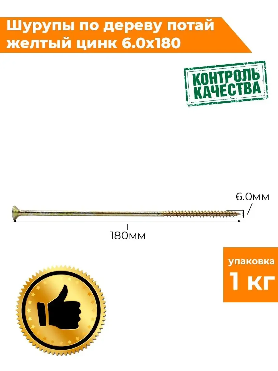 Шурупы по дереву потай 6.0х180 желтый цинк. Используются для скрепления разнообразных деревянных конструкций, для монтажа деталей из ДСП, для работы с фанерой. Потайная головка позволяет "спрятать" шуруп в материал. Длина, мм: 180;Диаметр, мм: 6.0. В упаковке 1кг.