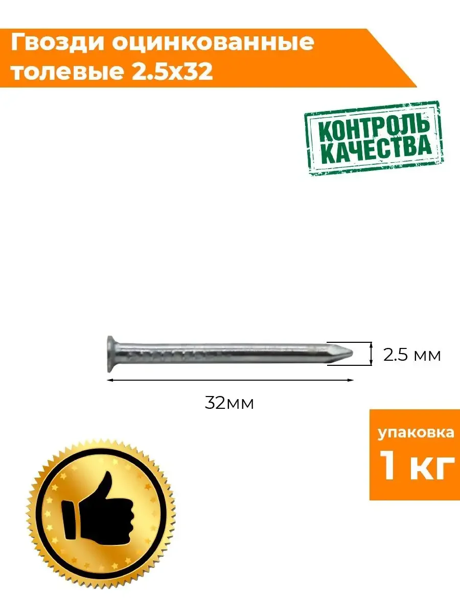 Гвозди оцинкованные толевые 2,5х32. Позволяют быстро крепить толь, рубероид, дранку, листовой металл или жесть, прочно удерживая их на крыше даже при сильном ветре. Длина, мм: 32;Диаметр, мм: 2.5. В упаковке 1кг.