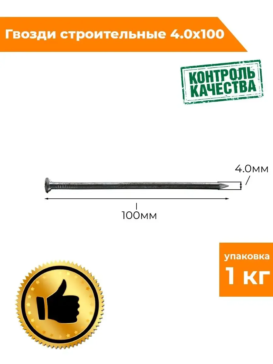 Гвозди строительные 4,0х100. Используются для соединения деревянных конструкций, крепления тонколистового металла до 0.9 мм. Длина, мм: 100;Диаметр, мм: 4.0. В упаковке 1кг.