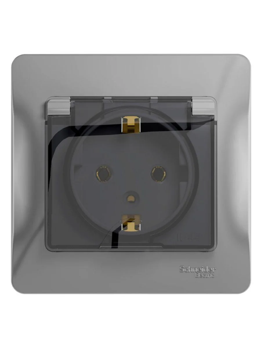 Розетка Systeme Electric (ранее Schneider Electric) серии Glossa (в сборе, цвет алюминий) одинарная с заземлением, шторками и крышкой подходит для сетей 250 В, на ток 16 А. - Заземляющий контакт обеспечивает дополнительную защиту от удара электрическим током. При наличии заземления электрический потенциал уходит в землю, защищая человека. - Выполнен из материала PС+ASA, стойкого к УФ-излучению и появлению царапин. - Эргономичные клеммы розеток расположены в один ряд.