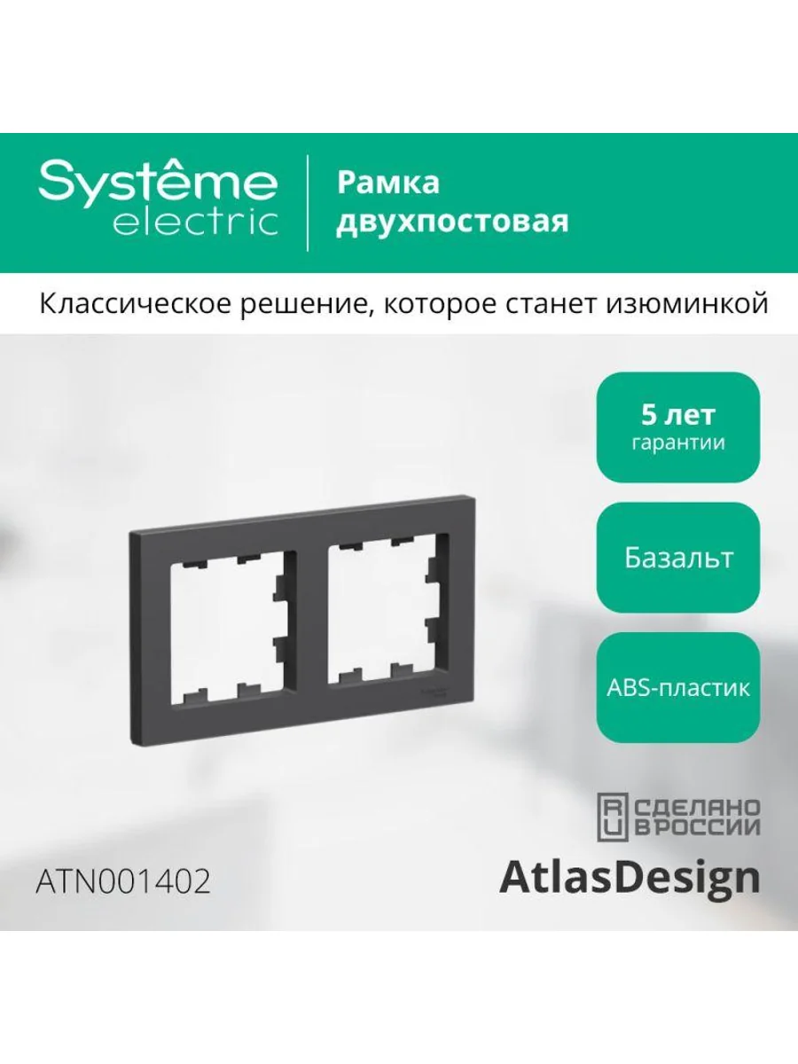 Рамка Systeme Electric (ранее Schneider Electric) серии AtlasDesign в цвете БАЗАЛЬТ двухместная. - Устанавливается в вертикальном и горизонтальном положениях. - Лицевые детали из качественного ABS-пластика, устойчивого к царапинам и УФ-излучению. - Позволяет гармонично вписать электроустановочное изделие в интерьер помещения.