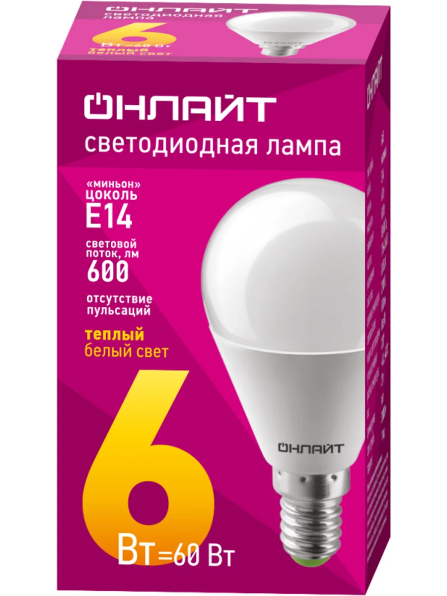 Лампа светодиодная 71 643 OLL-G45-6-230-2.7K-E14 ОНЛАЙТ 4670004716434 – лампа с шаровидной колбой, длиной 78 мм, с цоколем Е14, мощностью 6 Вт. Цветовая температура 2700 К. Дает теплый белый свет.