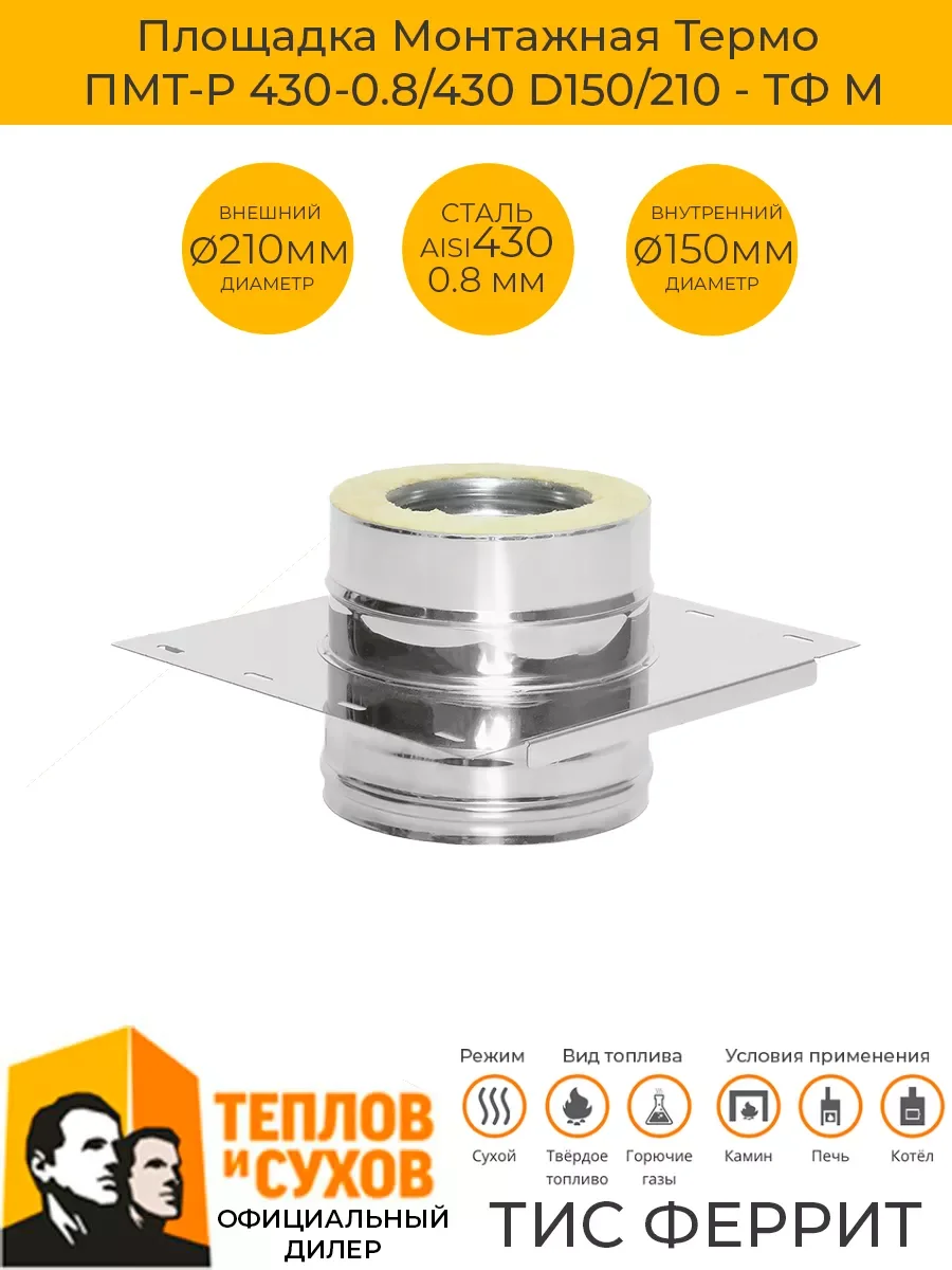 Монтажная площадка закрепляет дымоход, поддерживая его конфигурацию, и переносит нагрузку монтируемых над ней модулей на несущую конструкцию. Стыкуется с основными элементами дымохода и может использоваться совместно с креплением основным и креплением регулируемым. Состоит из участка трубы, соответствующего типу дымоходной системы (Моно или Термо) и опорной пластины с монтажными отверстиями. Опорная пластина закрепляется на трубе за счет двух наружных зигов. Ребра жесткости удерживают дымоход в статичном положении относительно вертикальной оси, принимая на себя вес вышерасположенной конструкции и перенося его на пластину. Монтажные отверстия пластины имеют удлиненную форму и вытянуты вдоль опорных частей силовых креплений. Это позволяет производить смещение площадки относительно опорной стены здания в пределах 30мм.