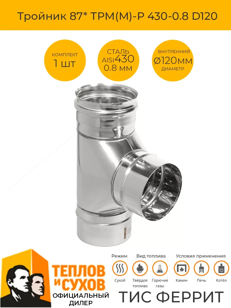 Предназначен для изменения направления дымового канала, используется в местах присоединения теплогенерирующего аппарата к основному каналу. Выполняет функцию очистного приспособления, облегчает обслуживание дымохода. Тройник 87* изготовлен из жаростойкой стали марки AISI 430. ДАННЫЙ ТОВАР ГАРАНТИРОВАННО СТЫКУЕТСЯ ТОЛЬКО С ПРОДУКЦИЕЙ ТЕПЛОВ И СУХОВ.