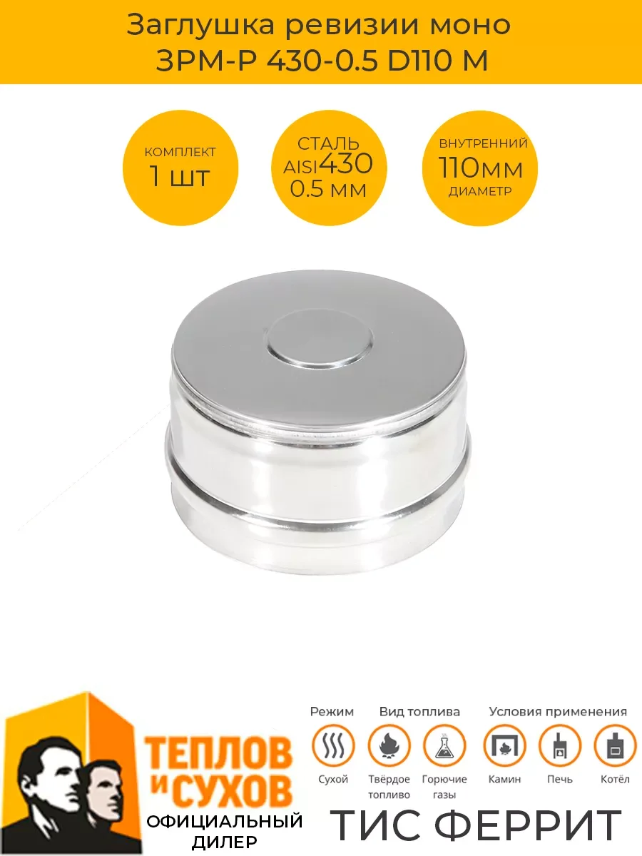 Данный товар гарантировано состыкуется только с продукцией Теплов И Сухов. Заглушка представляет собой трубный элемент, покрытый пластиной. Устанавливается на тройниках для контроля и сбора сажи и других фрагментов, попадающих в дымовой канал. Заглушка подбирается для тройников Моно по номинальному диаметру. Закрепляется на тройнике при помощи трубного хомута.