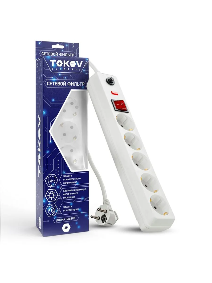 Удлинитель с сетевым фильтром 5х3м с заземл. с выкл. 16А с защ. от скачков напр. и перегрузок 3х1 бел. TOKOV ELECTRIC TKE-C01-SF5-3-ZV - купить в KeepBuilding | KeepBuilding