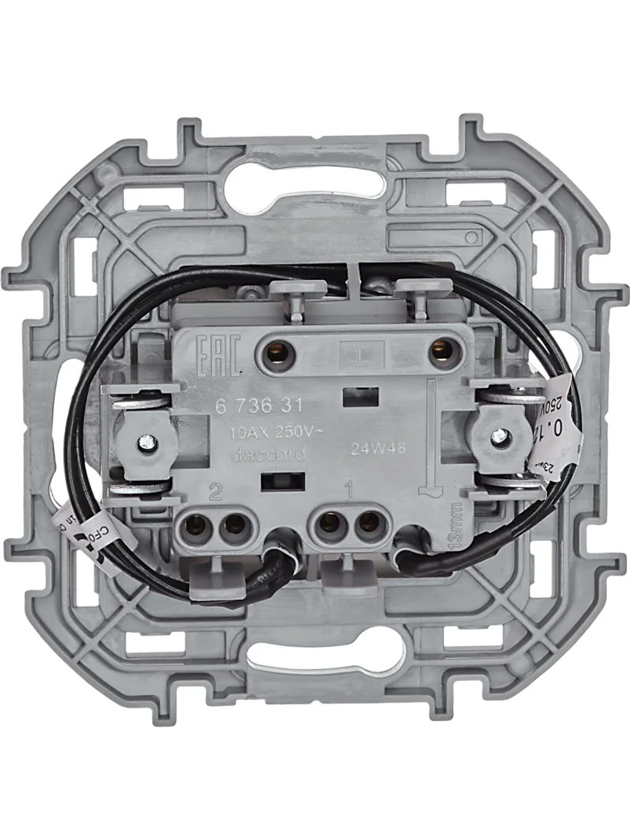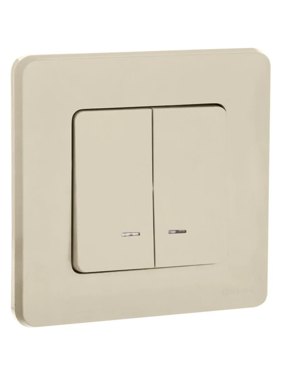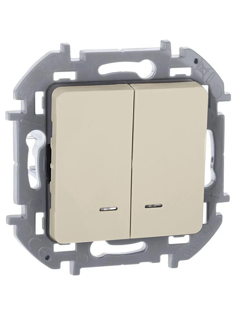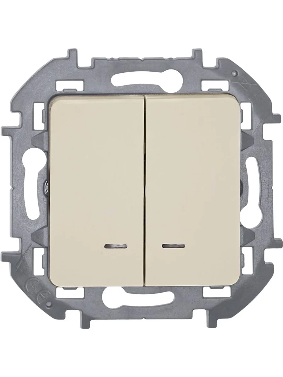 Выключатель двухклавишный с подсветкой/индикацией скрытого монтажа Inspiria, цвет "Слоновая кость", номинальный ток 10АХ, напряжение ~250В, безвинтовые зажимы. Устанавливается в жилых и общественных помещениях для управления приборами освещения, вентиляции и т.д. Предназначен для управления двумя электрическими цепями.