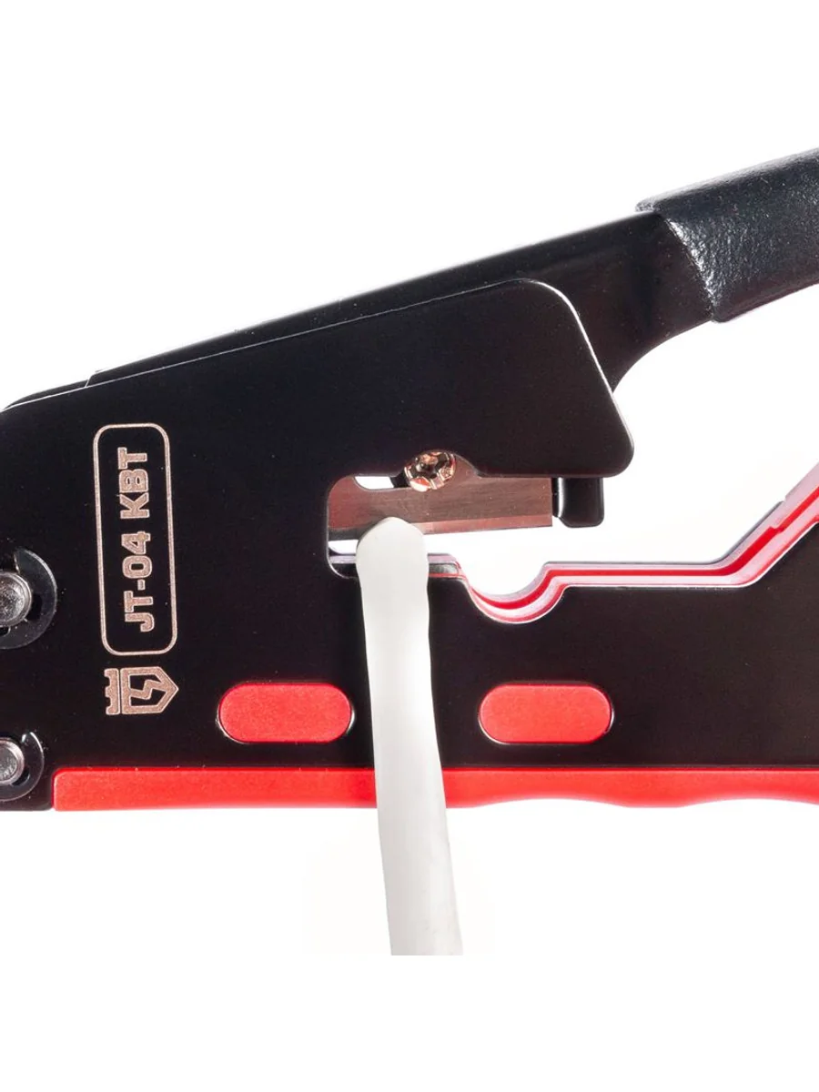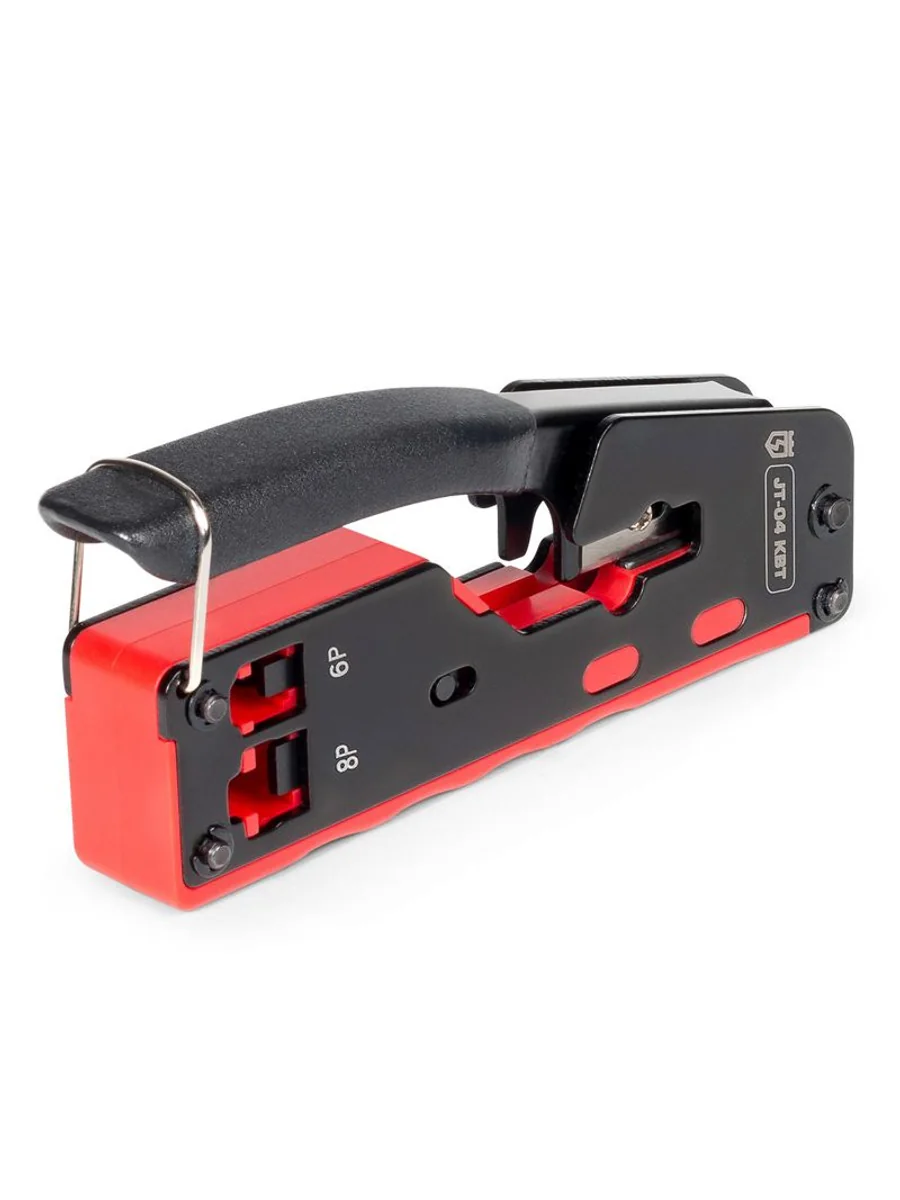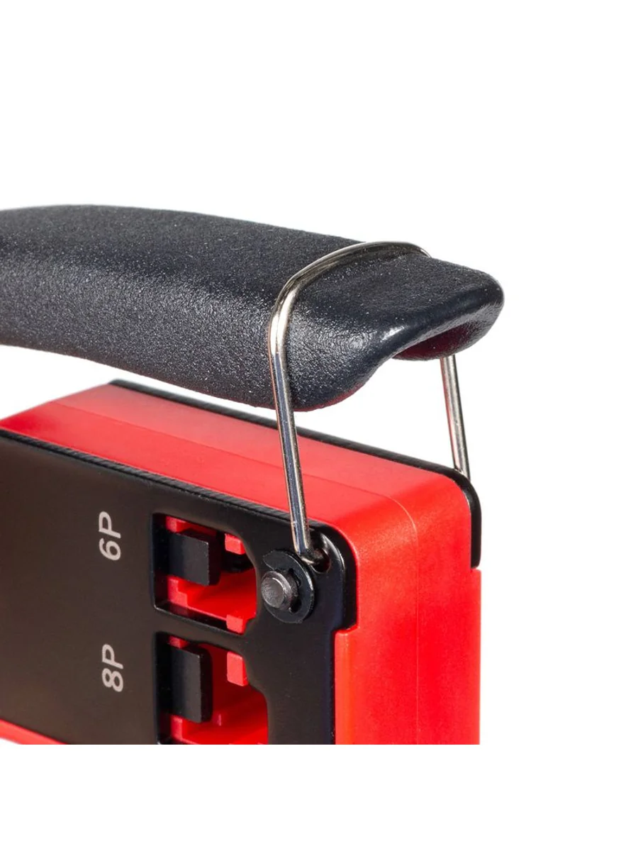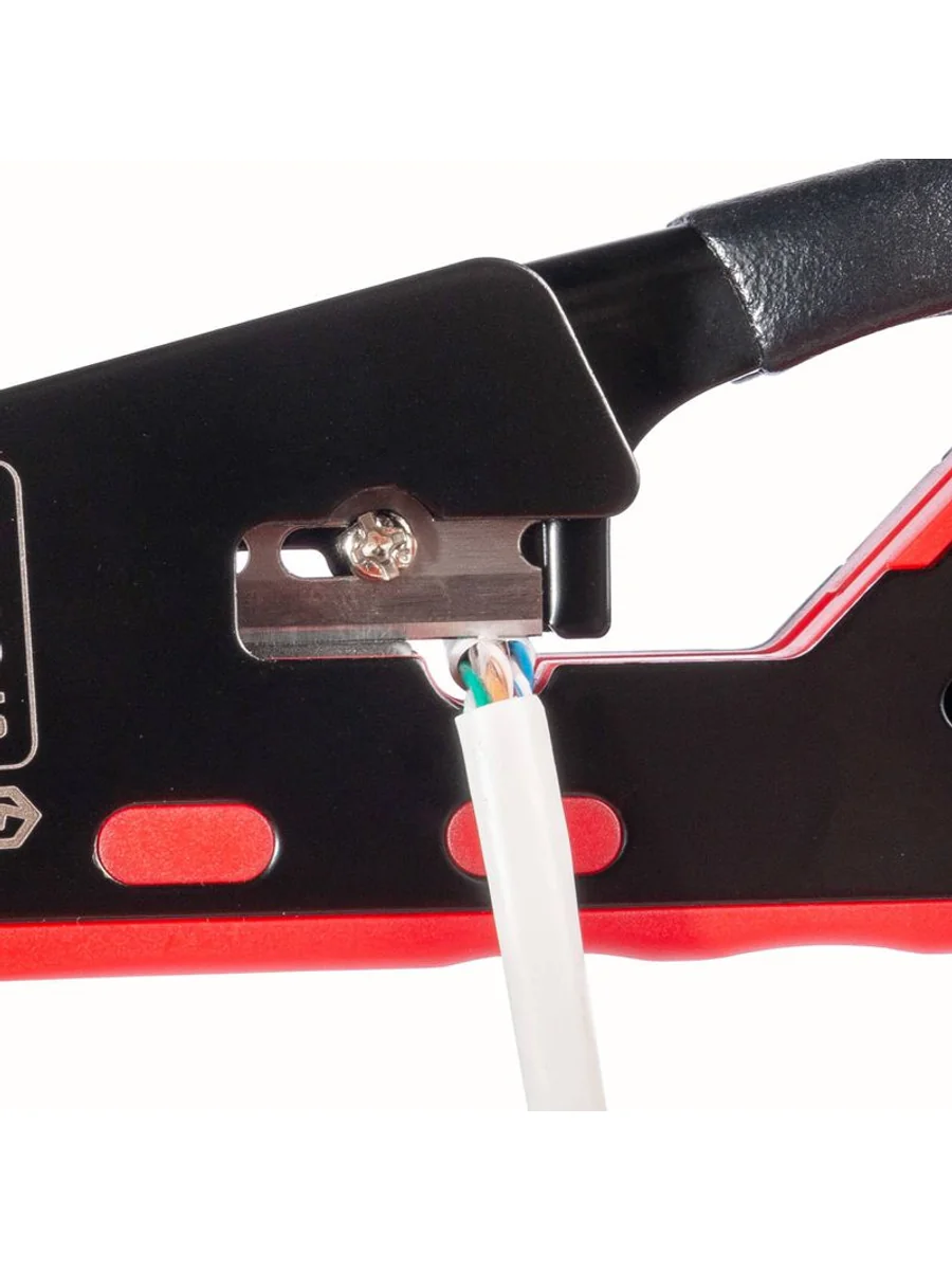 • 3 в 1: • обжим разъемов RJ • снятие оболочки с круглых проводов типа UTP, STP • резка проводов • Встроенные матрицы: 8Р, 6Р • Параллельный ход пуансонов гарантирует профессиональное качество работ • Обжим разъемов: • 8Р8С (RJ-45), • 6Р6С (RJ-12), 6P4C (RJ-11), 6Р2С • Блокиратор рукояток, возвратная пружина • Защитная панель, предохраняющая от порезов • Обработка поверхности: воронение • Эргономичные рукоятки из термопластрезины • Инновационный дизайн • Вес: 310 г • Длина: 140 мм