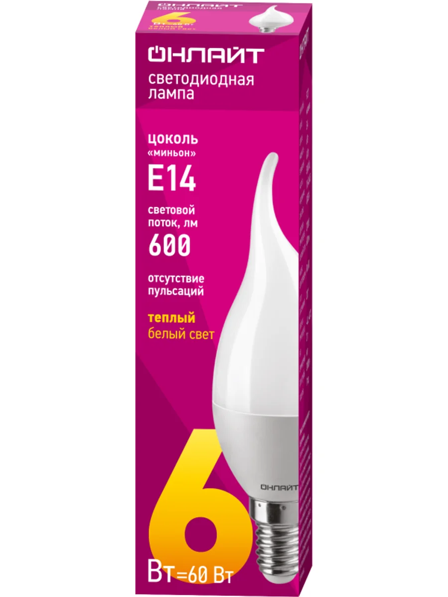 Лампа светодиодная 71 620 OLL-FC37-6-230-2.7K-E14-FR ОНЛАЙТ 4670004716205 – лампа с колбой вида "свеча", белого света, длиной 130 мм, с цоколем Е14, мощностью 6 Вт. Цветовая температура 2700 К.