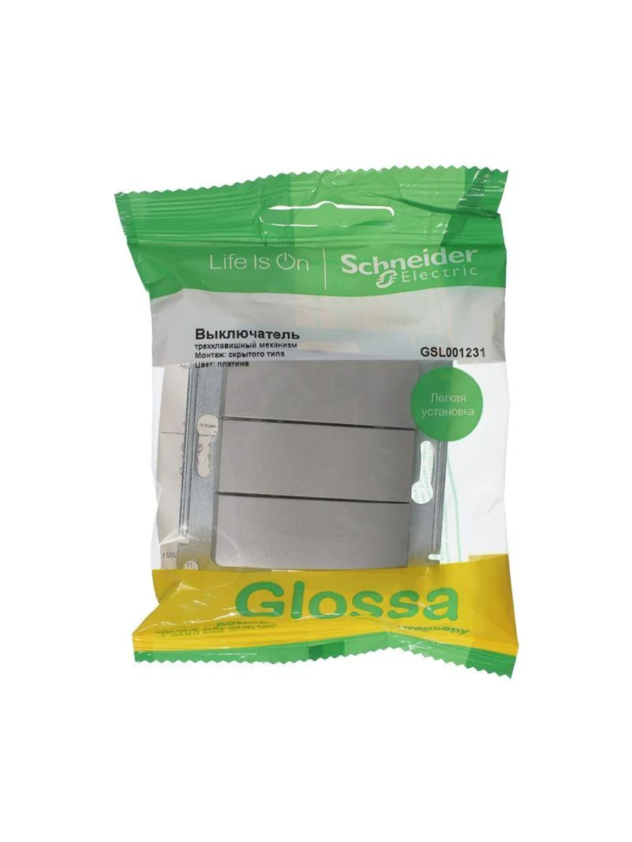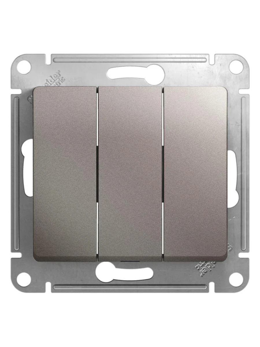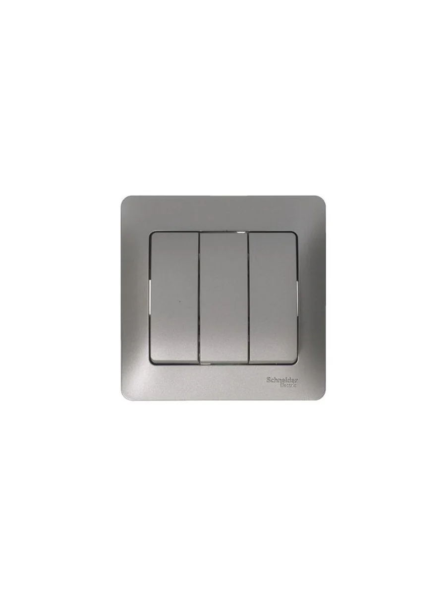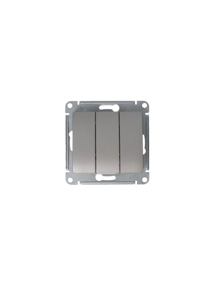 Механизм Systeme Electric (ранее Schneider Electric) серии Glossa (цвет платина) выключателя 3-клавишного подходит для сетей 250 В, на ток 10 А. - Трёхклавишный выключатель позволяет управлять тремя источниками света из одной точки. - Выполнен из материала PС+ASA, стойкого к УФ-излучению и появлению царапин. - Эргономичные клеммы расположены в два ряда: сверху и снизу.