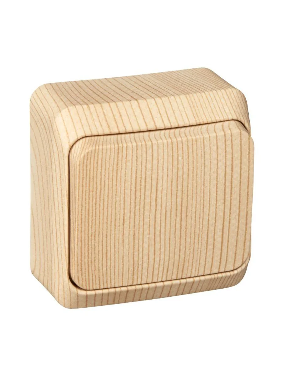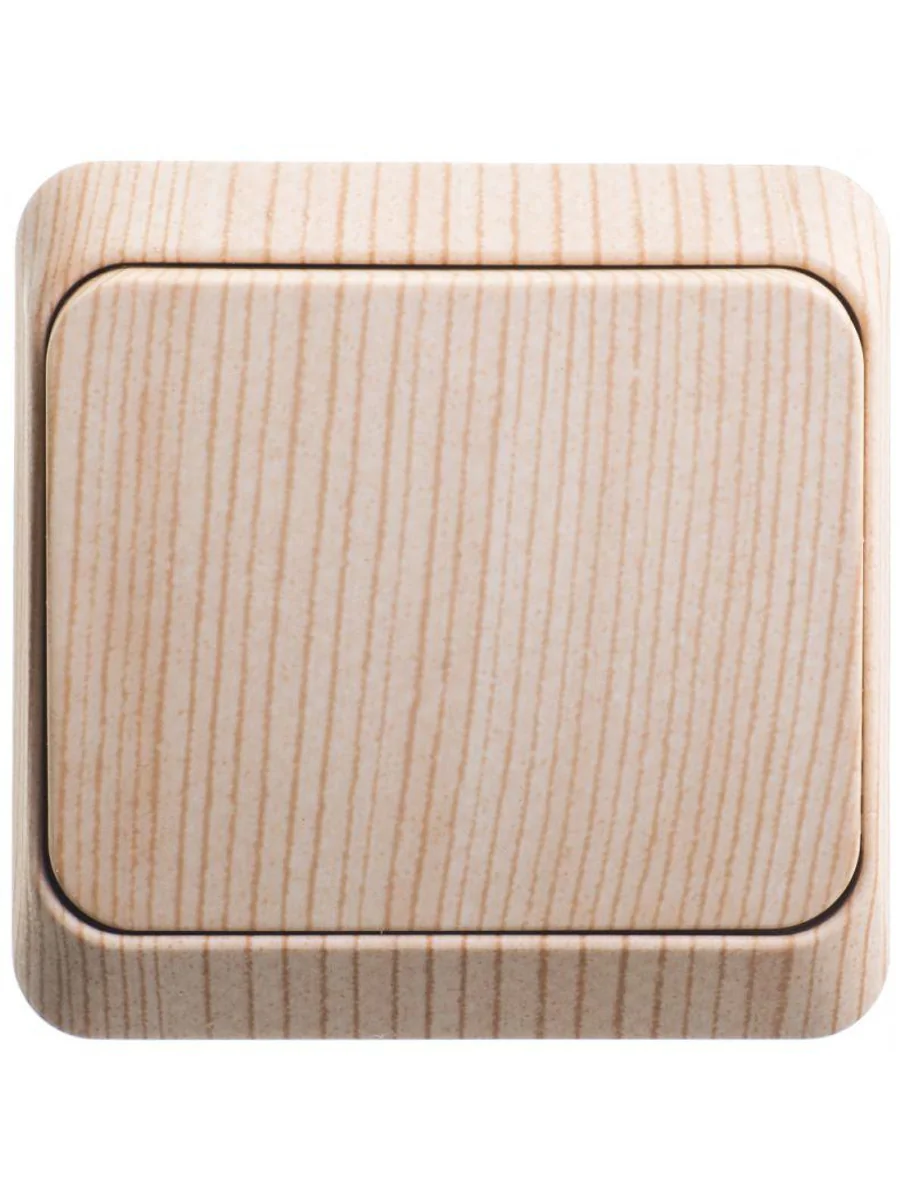 Выключатель Systeme Electric (ранее Schneider Electric) ЭТЮД (сосна, открытой установки) одноклавишный предназначен для применения в сетях до 250В, на ток до 10А. Выключатель подходит для большинства типов ламп, включая люминесцентные. Изделия цвета Сосна обладают уникальным рисунком, напоминающим древесный сруб. Он прост в установке и удобен в применении. Сделано в России.