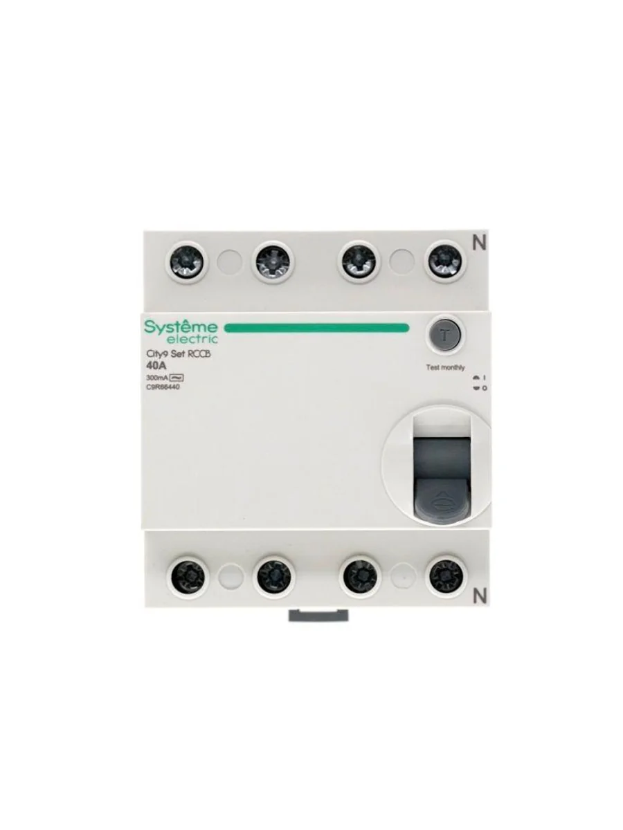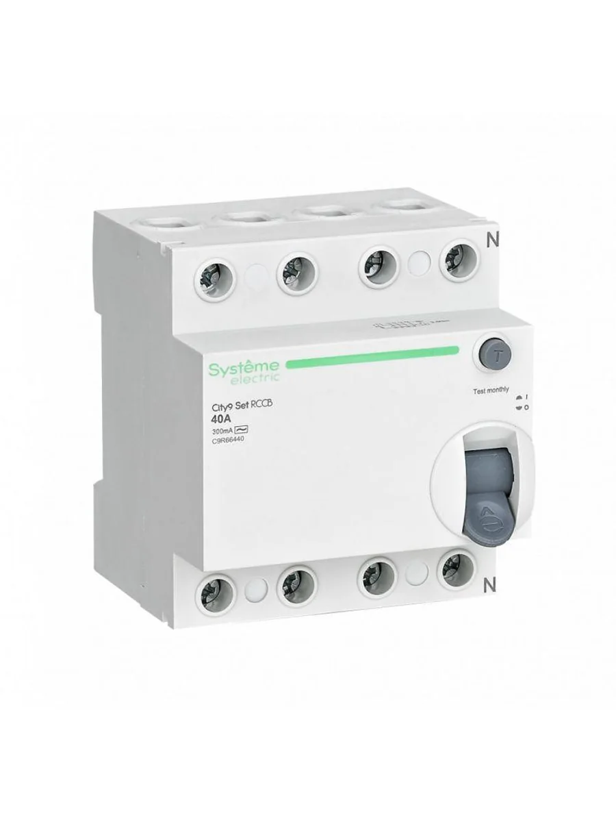 Выключатель дифференциального тока (ВДТ) или устройство защитного отключения (УЗО) серии City9 Set Systeme Electric, 4-полюсный, номинальный ток 40А, ток утечки 300 мА, тип АС, электромеханический. Применяется в электрических сетях напряжением 400В. Уставка по току утечки 300 мА обеспечивает гарантированную защиту людей при прямом и косвенном прикосновении. Кнопка тест обеспечивает проверку работоспособности аппарата. Крепление на DIN-рейку шириной 35 мм. Подключение сверху и снизу. Безопасные клеммы (ранее Schneider Electric A9R75440, EZ9R64440, R9R54440).