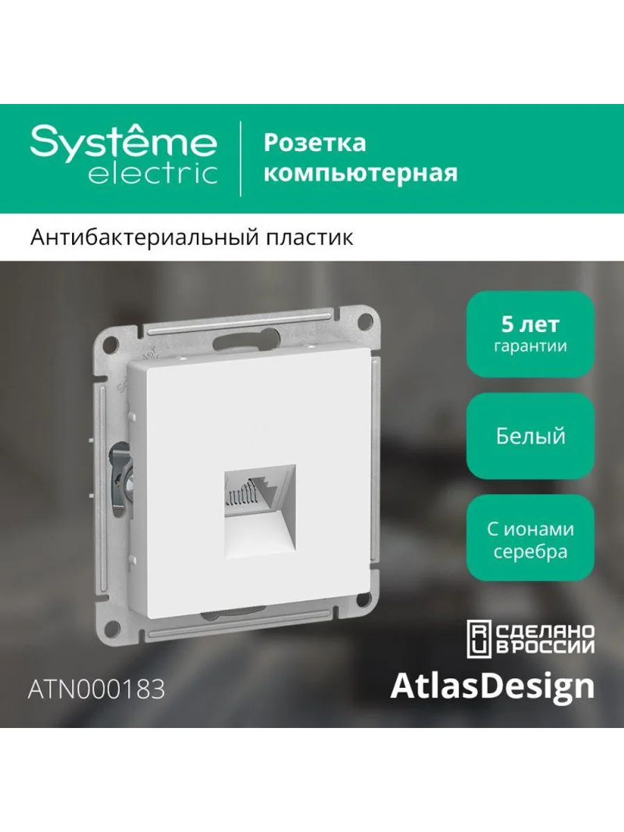 Механизм Systeme Electric (ранее Schneider Electric) серии AtlasDesign в цвете белый розетки компьютерной с разъёмом RJ45 категория 5е предназначен для удобного и быстрого подключения вашего компьютера к локальной вычислительной сети. Пластик с ионами серебра в белом цвете обеспечивает антибактериальный эффект. Лицевые детали из качественного ABS-пластика, устойчивого к царапинам и УФ-излучению. Усиленные прямые монтажные лапки для лучшей фиксации механизма в монтажной коробке.