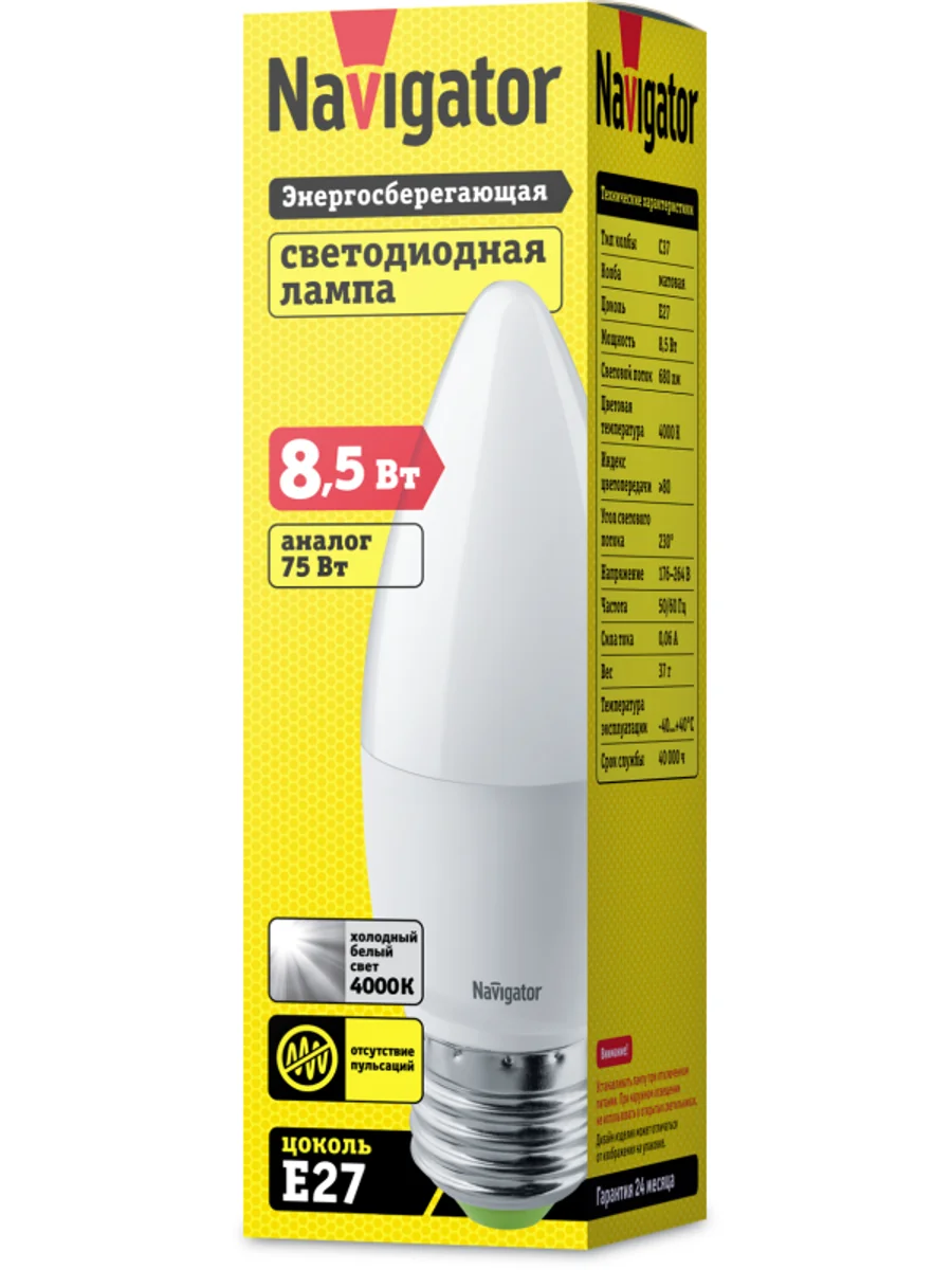 Лампа светодиодная 61 328 NLL-C37-8.5-230-4K-E27-FR 8.5Вт свеча матовая 4000К нейтр. бел. E27 680лм 176-264В Navigator 61328