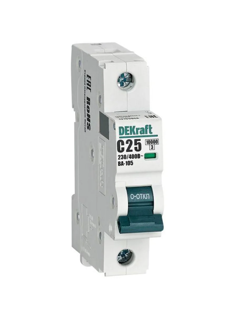 Автоматический выключатель серии ВА-105 Dekraft; 1P; ном. ток 25 А; характеристика C; откл. способность 10 кА; ширина модуля 18мм. Аппараты имеют механизм мгновенной коммутации, 6 монолитных заклепок, которые повышают прочность корпуса. Боковые каналы охлаждения повышают стабильность работы при высоких температурах окружающей среды. Есть возможность установки дополнительных аксессуаров с левой стороны устройства. Аппарат на 100% совместим с корпусами и оболочками Dekraft и Systeme Electric.