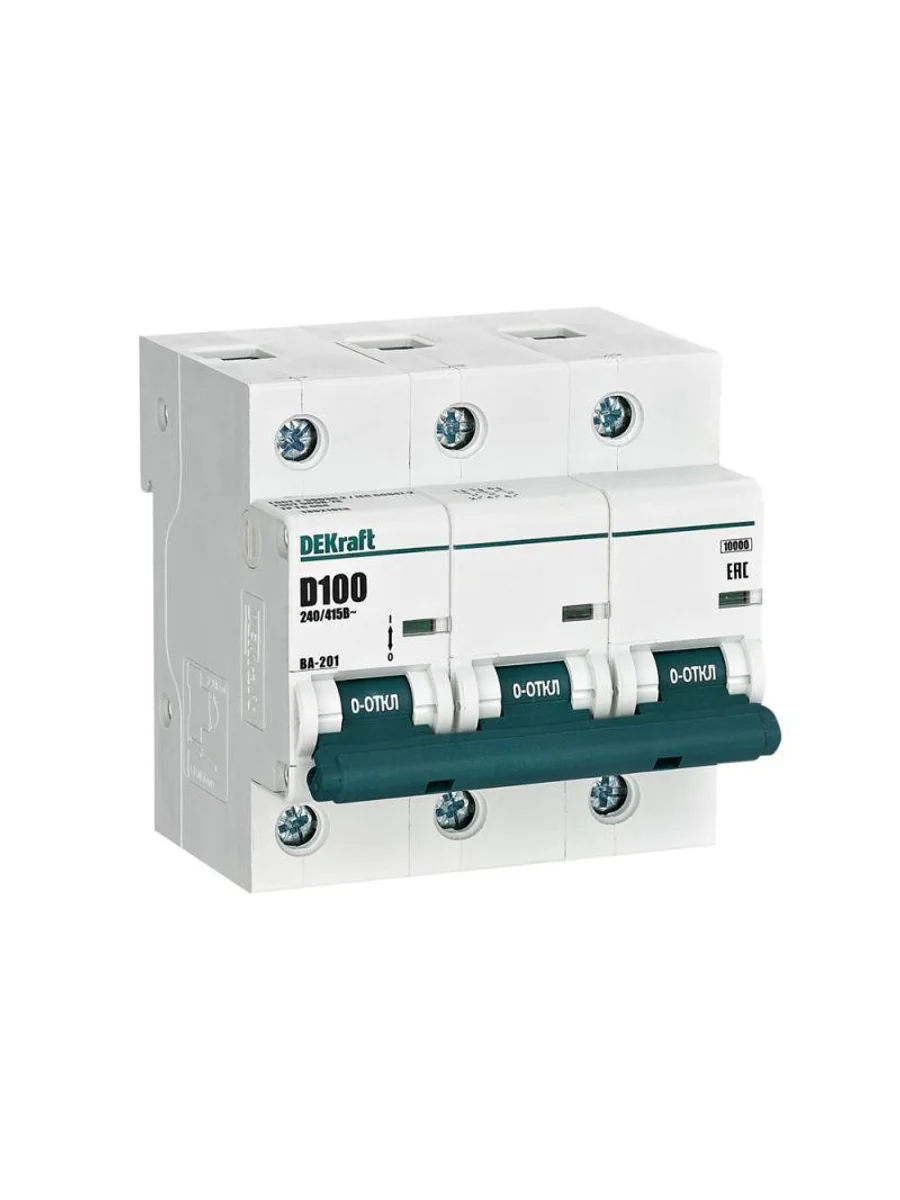 Автоматический выключатель серии ВА-201 Dekraft; 3P; номинальный ток 100 А; характеристика D; отключающая способность 10 кА; ширина модуля 27мм. Монолитная лицевая панель обеспечивает безопасную эксплуатацию аппарата. Окошко-индикатор всегда показывает состояние аппарата вне зависимости от положения рукоятки управления. Двухпозиционная защелка облегчает монтаж выключателя. Аппарат на 100% совместим с корпусами и оболочками Dekraft, Systeme Electric.