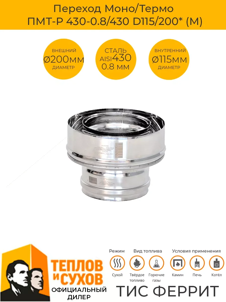 Переход Моно-Термо предназначен для перехода с неутепленного дымового канала Моно на утепленный Термо. Переход Моно-Термо является стартовым элементом для утепленного дымохода Термо, изолирует утеплитель трубы Термо.Картинки: ArrayТолщина металла (внутренняя): 0.8Толщина металла (наружная): 0.5Диаметр (наружный): 195Марка стали (внутренняя): 430Марка стали (наружная): 430Диаметр (внутренний): 115