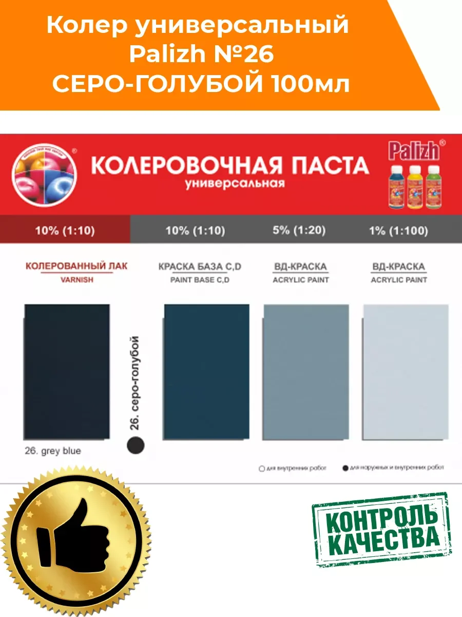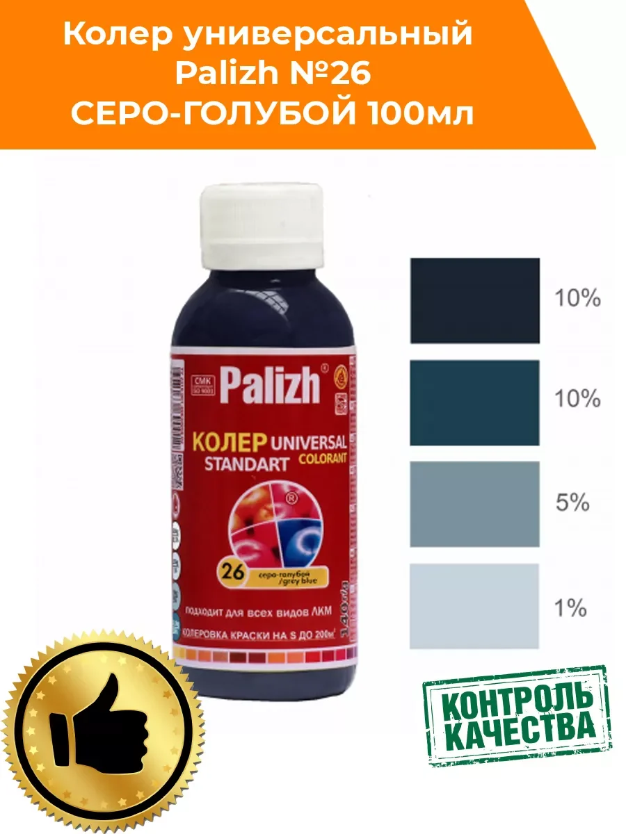 Универсальная колеровочная паста "Palizh" STANDART предназначена для колерования воднодисперсионных, алкидных (ПФ) лакокрасочных материалов: краски, лаки, эмали, шпатлевки, затирки, пропитки, грунтовки, штукатурки, гипсовые смеси. Не применять для колерования составов, содержащих масла и воски. Насыщенность цвета можно регулировать в процессе смешивания. Колеровка не изменяет первоначальных свойств краски (при соблюдении рекомендованного процента ввода) .Инструмент легко очищается водой. Не использовать как самостоятельный продукт. Для получения ярких оттенков используйте краски, эмали с обозначением База С ( D) или лаки. Храните в сухом помещении при температуре от +5 до + 30°С. Срок годности в невскрытой таре производителя - 36 мес. Допускается замораживание при транспортировке сроком не более 1 мес. Выдерживает 5 циклов заморозки/разморозки, после оттаивания и тщательного перемешивания сохраняет свои свойства. Совместимость ПФ-эмали, грунты, затирки для швов, краски акриловые (ВД), лаки акриловые (ВД), пропитки для дерева акриловые (ВД), шпатлевки акриловые/латексные (ВД), штукатурки декоративные. Применение: 1. Пасту перемешать; 2. Ввести пасту в небольшой объём колеруемого материала; 3. Перемешать; 4. Смесь перемешать со всем объемом колеруемого материала *вводить не более 5% возможно добавление до 10% по рекомендации производителя колеруемого материала *не использовать как самостоятельное покрытие *не использовать для воска и масел *перед применением рекомендовано предварительное тестирование.