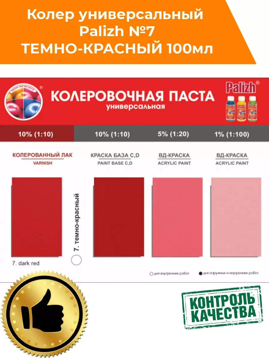 Универсальная колеровочная паста "Palizh" STANDART предназначена для колерования воднодисперсионных, алкидных (ПФ) лакокрасочных материалов: краски, лаки, эмали, шпатлевки, затирки, пропитки, грунтовки, штукатурки, гипсовые смеси. Не применять для колерования составов, содержащих масла и воски. Насыщенность цвета можно регулировать в процессе смешивания. Колеровка не изменяет первоначальных свойств краски (при соблюдении рекомендованного процента ввода) .Инструмент легко очищается водой. Не использовать как самостоятельный продукт. Для получения ярких оттенков используйте краски, эмали с обозначением База С ( D) или лаки. Храните в сухом помещении при температуре от +5 до + 30°С. Срок годности в невскрытой таре производителя - 36 мес. Допускается замораживание при транспортировке сроком не более 1 мес. Выдерживает 5 циклов заморозки/разморозки, после оттаивания и тщательного перемешивания сохраняет свои свойства. Совместимость ПФ-эмали, грунты, затирки для швов, краски акриловые (ВД), лаки акриловые (ВД), пропитки для дерева акриловые (ВД), шпатлевки акриловые/латексные (ВД), штукатурки декоративные/ Применение: 1. Пасту перемешать; 2. Ввести пасту в небольшой объём колеруемого материала; 3. Перемешать; 4. Смесь перемешать со всем объемом колеруемого материала *вводить не более 5% возможно добавление до 10% по рекомендации производителя колеруемого материала *не использовать как самостоятельное покрытие *не использовать для воска и масел *перед применением рекомендовано предварительное тестирование.
