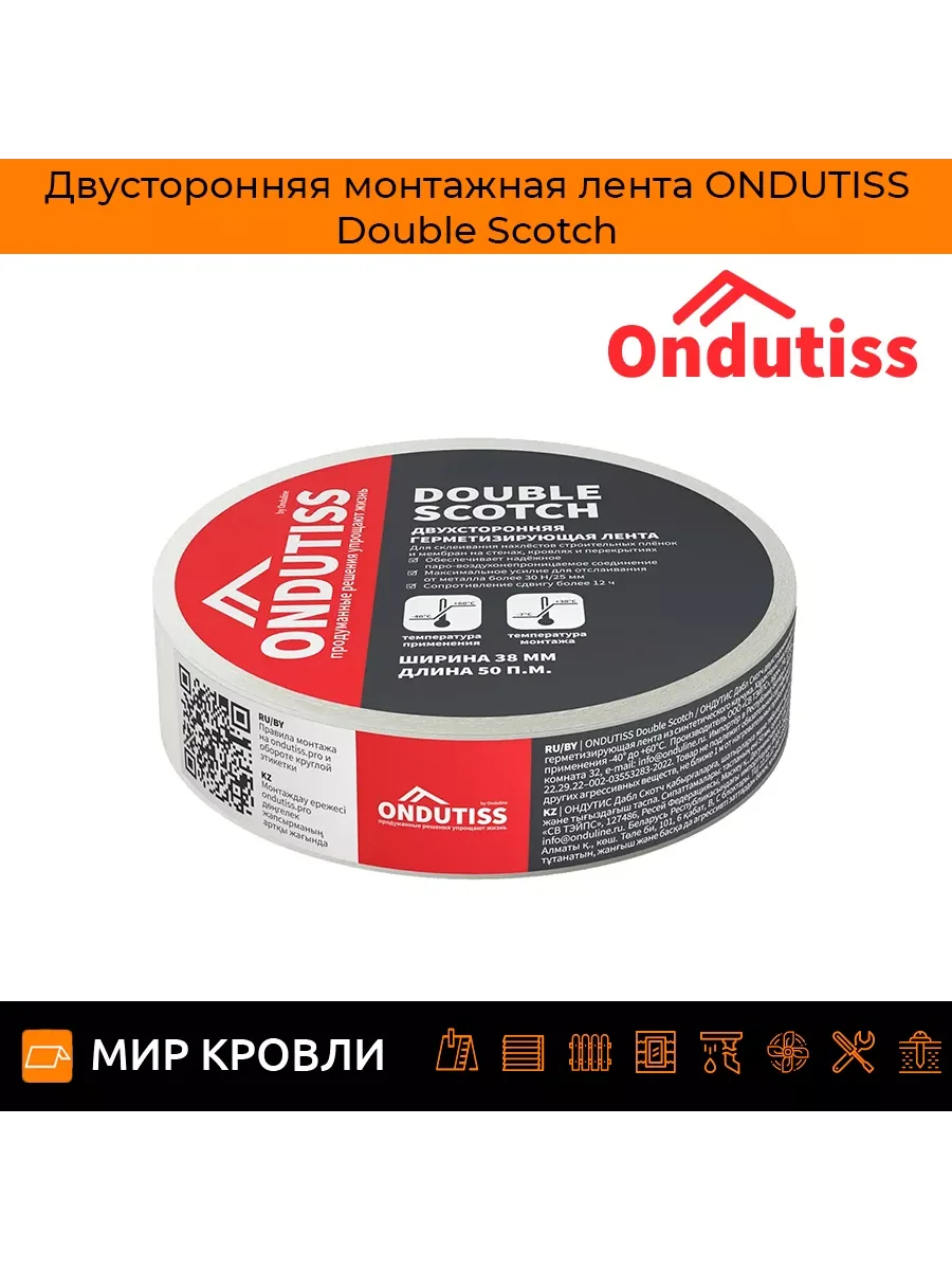 ONDUTISS Butyl Tape – двухсторонняя бутилкаучуковая соединительная лента на антиадгезионной бумаге. Обеспечивает надёжное паро-воздухонепроницаемое соединение в течение долгого времени. Внимание! Это — новая позиция в линейке ONDUTISS. Её близким аналогом до 2023 была ONDUTISS BL, которая снята с производства в январе 2023.