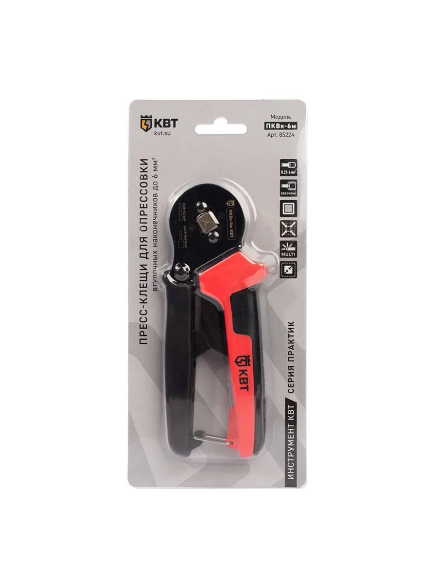 • Диапазон сечений втулочных наконечников: • НШВИ, НШВ: 0.25–6.0 мм2 • НШВИ(2): 2х0.5–2х4.0 мм2 • Универсальный инструмент для опрессовки втулочных наконечников • Одна саморегулирующаяся матрица на все типоразмеры диапазона • Ширина обжимной матрицы: 13 мм • Инструмент перекрывает диапазон из 16 размеров втулочных наконечников • Квадратный профиль обжима с рифлением • Двухкомпонентные эргономичные рукоятки • Фиксатор рукояток • Вес: 250 г • Длина: 150 мм