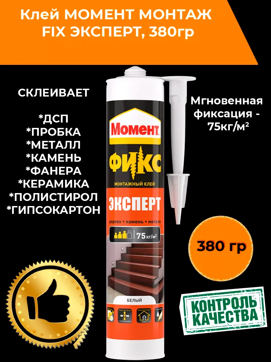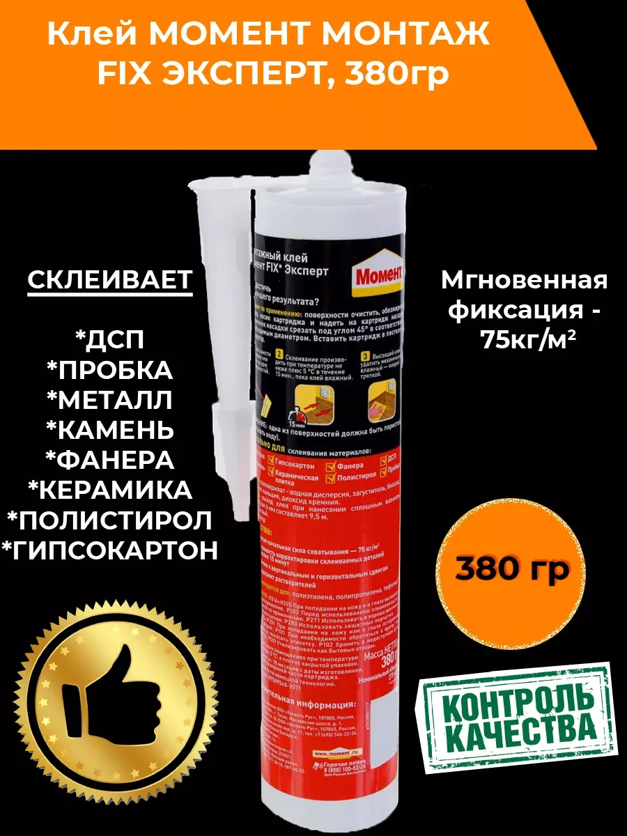 Идеально подходит для склеивания различных строительных и отделочных материалов. Клей монтажный Момент FIX Эксперт 380 г не содержит органических растворителей. Применяется для установки подоконников и дверных рам, стеновых панелей из дерева, ПВХ, пробки, гипрока, Приклеивания изоляционных панелей, декоративных деталей, профилей. Для приклеивания плинтусов и декоративных фризов. Одна из соединяемых поверхностей должна быть пористой (впитывать воду). НЕ ПОДХОДИТ: для полиэтилена, полипропилена и тефлона.
