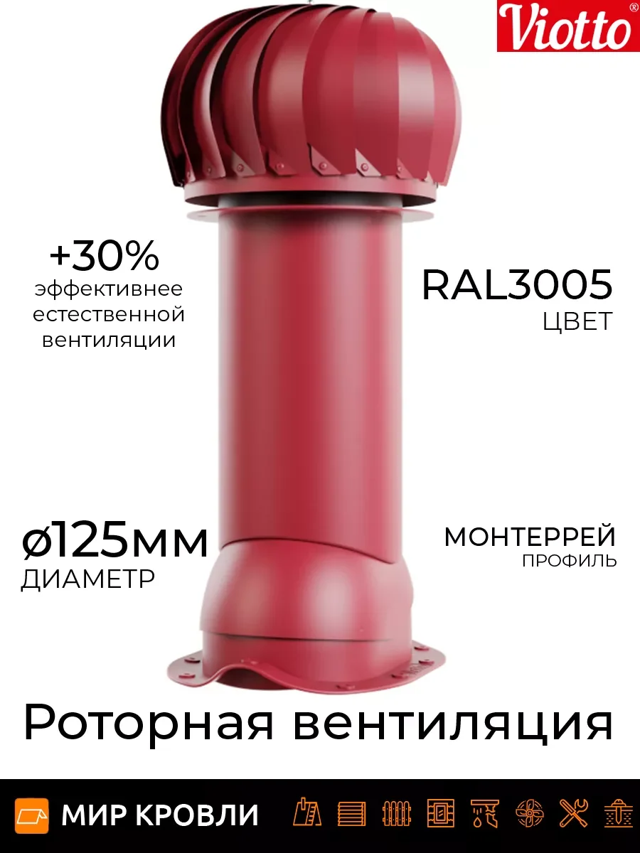 Роторная вентиляция работает без потребления электроэнергии. Используя энергию ветра, увеличивается циркуляцию воздуха, тем самым устройство эффективно вытягивает отработанный воздух из самых различных помещений. Технические характеристики Применяемая турбина оснащена лопастями геометрия которых увеличивает тягу за счет создания давления в вентиляционном канале, что предотвращает эффект обратной тяги На 30% эффективнее естественной вентиляции Ось вращения с заводской балансировкой обеспечивает равномерность и плавность вращения лопастей Узел вращения защищён от попадания влаги, позволяет эксплуатировать устройство от — 45 до + 80 градусов Диаметр трубы 110 мм/ 125 мм /150 мм, она может быть утепленной и не утепленной Есть возможность установки на готовую мягкую и фальцевую кровлю, металлочерепицу «Монтеррей», мягкую кровлю при монтаже, на профнастилы высотой 20 и 21мм. При использовании универсального проходного элемента подойдет на любой тип металлочерепицы и профнастил до 35 мм. Система уровня на шарнире, предоставляющая возможность точной и эргономичной установки.