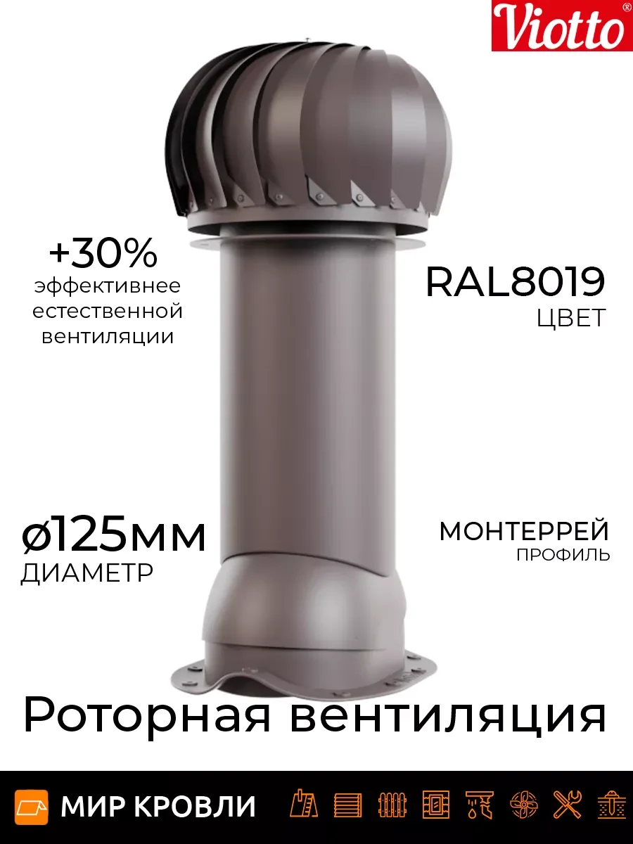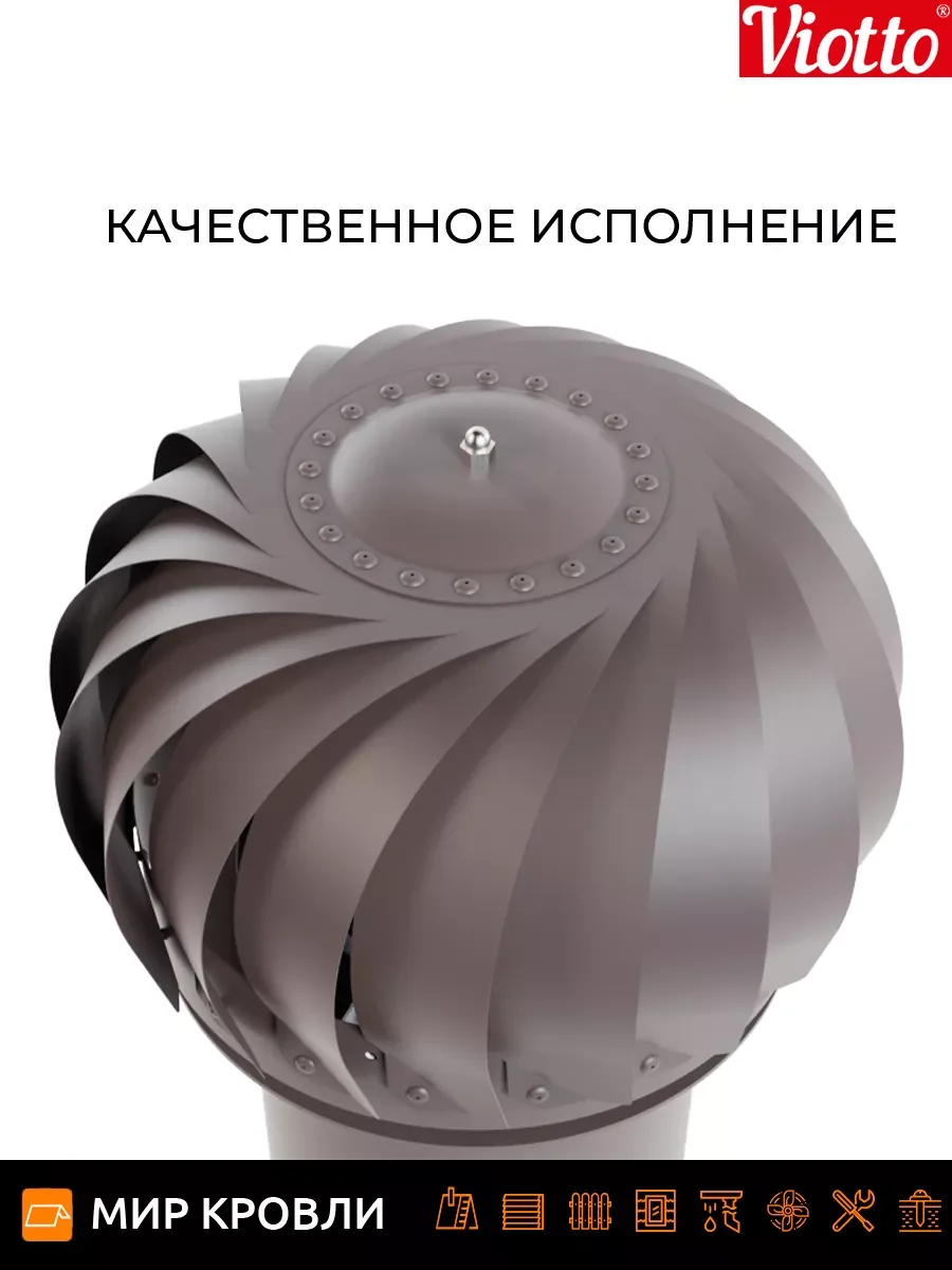 Роторная вентиляция работает без потребления электроэнергии. Используя энергию ветра, увеличивается циркуляцию воздуха, тем самым устройство эффективно вытягивает отработанный воздух из самых различных помещений. Технические характеристики Применяемая турбина оснащена лопастями геометрия которых увеличивает тягу за счет создания давления в вентиляционном канале, что предотвращает эффект обратной тяги На 30% эффективнее естественной вентиляции Ось вращения с заводской балансировкой обеспечивает равномерность и плавность вращения лопастей Узел вращения защищён от попадания влаги, позволяет эксплуатировать устройство от — 45 до + 80 градусов Диаметр трубы 110 мм/ 125 мм /150 мм, она может быть утепленной и не утепленной Есть возможность установки на готовую мягкую и фальцевую кровлю, металлочерепицу «Монтеррей», мягкую кровлю при монтаже, на профнастилы высотой 20 и 21мм. При использовании универсального проходного элемента подойдет на любой тип металлочерепицы и профнастил до 35 мм. Система уровня на шарнире, предоставляющая возможность точной и эргономичной установки.