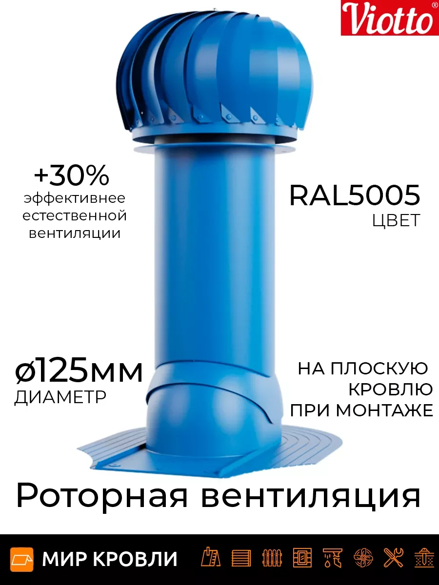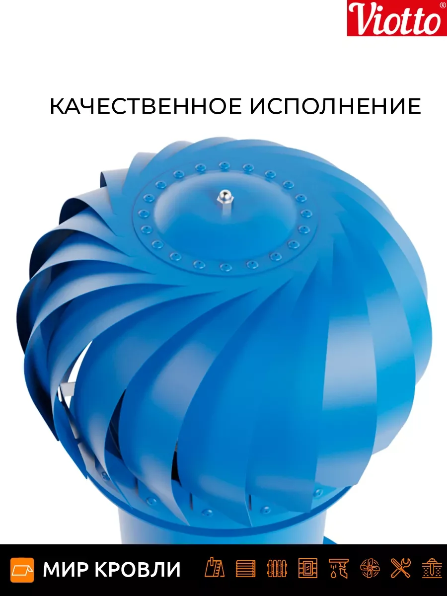 Роторная вентиляция работает без потребления электроэнергии. Используя энергию ветра, увеличивается циркуляцию воздуха, тем самым устройство эффективно вытягивает отработанный воздух из самых различных помещений. Технические характеристики Применяемая турбина оснащена лопастями геометрия которых увеличивает тягу за счет создания давления в вентиляционном канале, что предотвращает эффект обратной тяги На 30% эффективнее естественной вентиляции Ось вращения с заводской балансировкой обеспечивает равномерность и плавность вращения лопастей Узел вращения защищён от попадания влаги, позволяет эксплуатировать устройство от — 45 до + 80 градусов Диаметр трубы 110 мм/ 125 мм /150 мм, она может быть утепленной и не утепленной Есть возможность установки на готовую мягкую и фальцевую кровлю, металлочерепицу «Монтеррей», мягкую кровлю при монтаже, на профнастилы высотой 20 и 21мм. При использовании универсального проходного элемента подойдет на любой тип металлочерепицы и профнастил до 35 мм. Система уровня на шарнире, предоставляющая возможность точной и эргономичной установки.