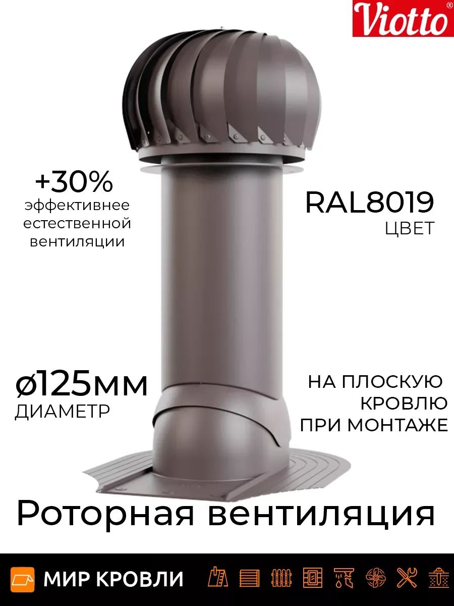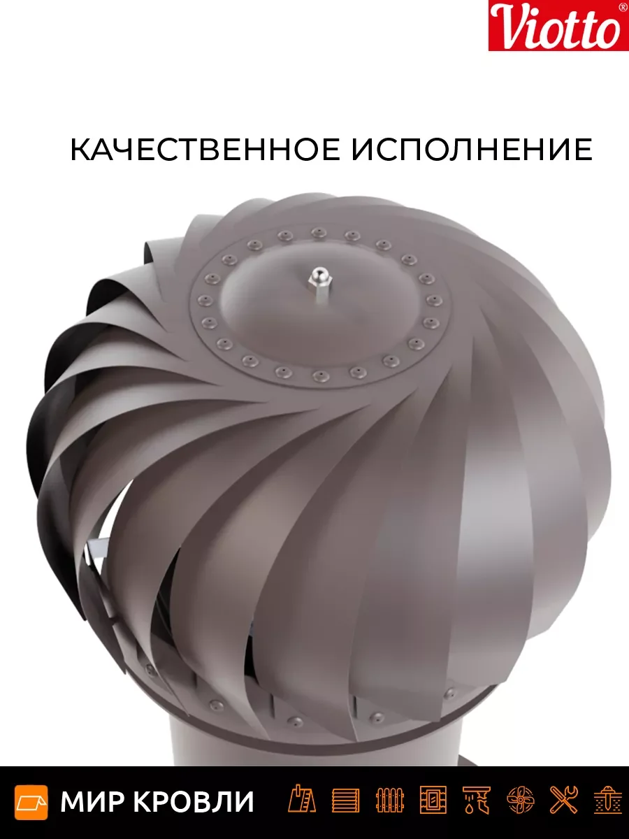 Роторная вентиляция работает без потребления электроэнергии. Используя энергию ветра, увеличивается циркуляцию воздуха, тем самым устройство эффективно вытягивает отработанный воздух из самых различных помещений. Технические характеристики Применяемая турбина оснащена лопастями геометрия которых увеличивает тягу за счет создания давления в вентиляционном канале, что предотвращает эффект обратной тяги На 30% эффективнее естественной вентиляции Ось вращения с заводской балансировкой обеспечивает равномерность и плавность вращения лопастей Узел вращения защищён от попадания влаги, позволяет эксплуатировать устройство от — 45 до + 80 градусов Диаметр трубы 110 мм/ 125 мм /150 мм, она может быть утепленной и не утепленной Есть возможность установки на готовую мягкую и фальцевую кровлю, металлочерепицу «Монтеррей», мягкую кровлю при монтаже, на профнастилы высотой 20 и 21мм. При использовании универсального проходного элемента подойдет на любой тип металлочерепицы и профнастил до 35 мм. Система уровня на шарнире, предоставляющая возможность точной и эргономичной установки.