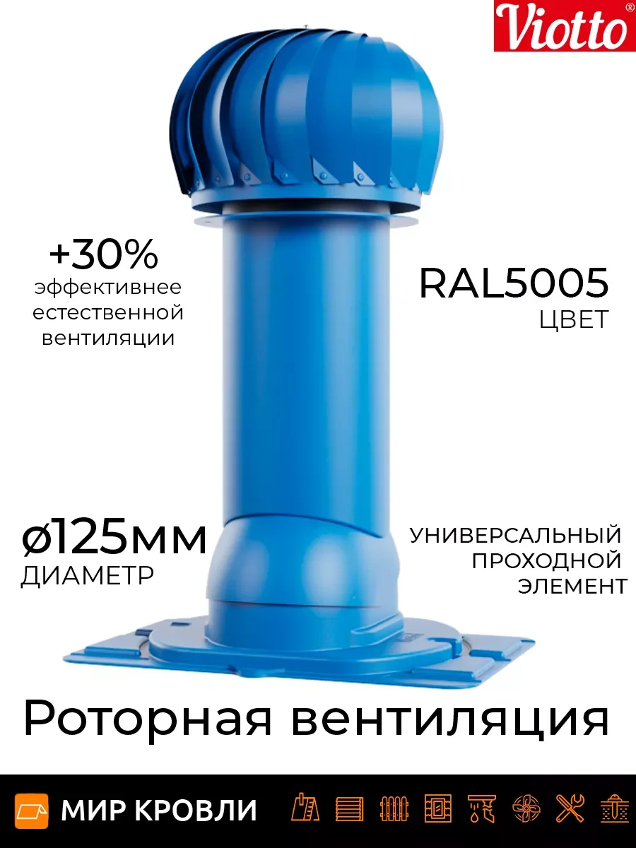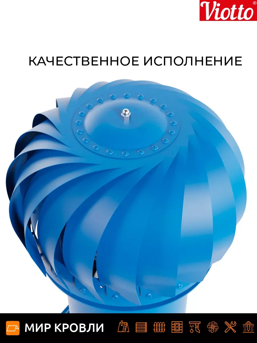 Роторная вентиляция работает без потребления электроэнергии. Используя энергию ветра, увеличивается циркуляцию воздуха, тем самым устройство эффективно вытягивает отработанный воздух из самых различных помещений. Технические характеристики Применяемая турбина оснащена лопастями геометрия которых увеличивает тягу за счет создания давления в вентиляционном канале, что предотвращает эффект обратной тяги На 30% эффективнее естественной вентиляции Ось вращения с заводской балансировкой обеспечивает равномерность и плавность вращения лопастей Узел вращения защищён от попадания влаги, позволяет эксплуатировать устройство от — 45 до + 80 градусов Диаметр трубы 110 мм/ 125 мм /150 мм, она может быть утепленной и не утепленной Есть возможность установки на готовую мягкую и фальцевую кровлю, металлочерепицу «Монтеррей», мягкую кровлю при монтаже, на профнастилы высотой 20 и 21мм. При использовании универсального проходного элемента подойдет на любой тип металлочерепицы и профнастил до 35 мм. Система уровня на шарнире, предоставляющая возможность точной и эргономичной установки.