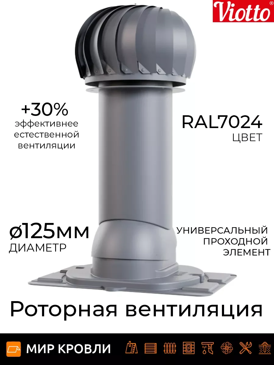 Роторная вентиляция работает без потребления электроэнергии. Используя энергию ветра, увеличивается циркуляцию воздуха, тем самым устройство эффективно вытягивает отработанный воздух из самых различных помещений. Технические характеристики Применяемая турбина оснащена лопастями геометрия которых увеличивает тягу за счет создания давления в вентиляционном канале, что предотвращает эффект обратной тяги На 30% эффективнее естественной вентиляции Ось вращения с заводской балансировкой обеспечивает равномерность и плавность вращения лопастей Узел вращения защищён от попадания влаги, позволяет эксплуатировать устройство от — 45 до + 80 градусов Диаметр трубы 110 мм/ 125 мм /150 мм, она может быть утепленной и не утепленной Есть возможность установки на готовую мягкую и фальцевую кровлю, металлочерепицу «Монтеррей», мягкую кровлю при монтаже, на профнастилы высотой 20 и 21мм. При использовании универсального проходного элемента подойдет на любой тип металлочерепицы и профнастил до 35 мм. Система уровня на шарнире, предоставляющая возможность точной и эргономичной установки.