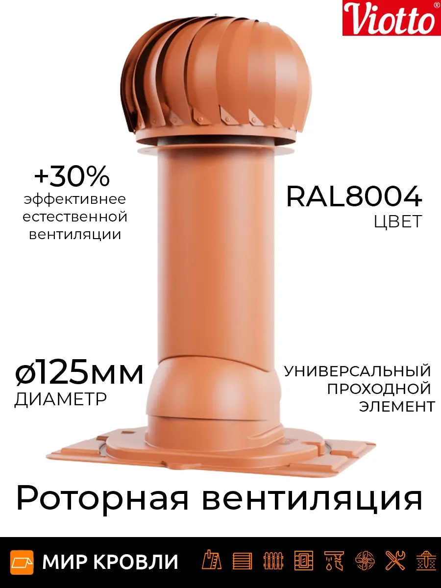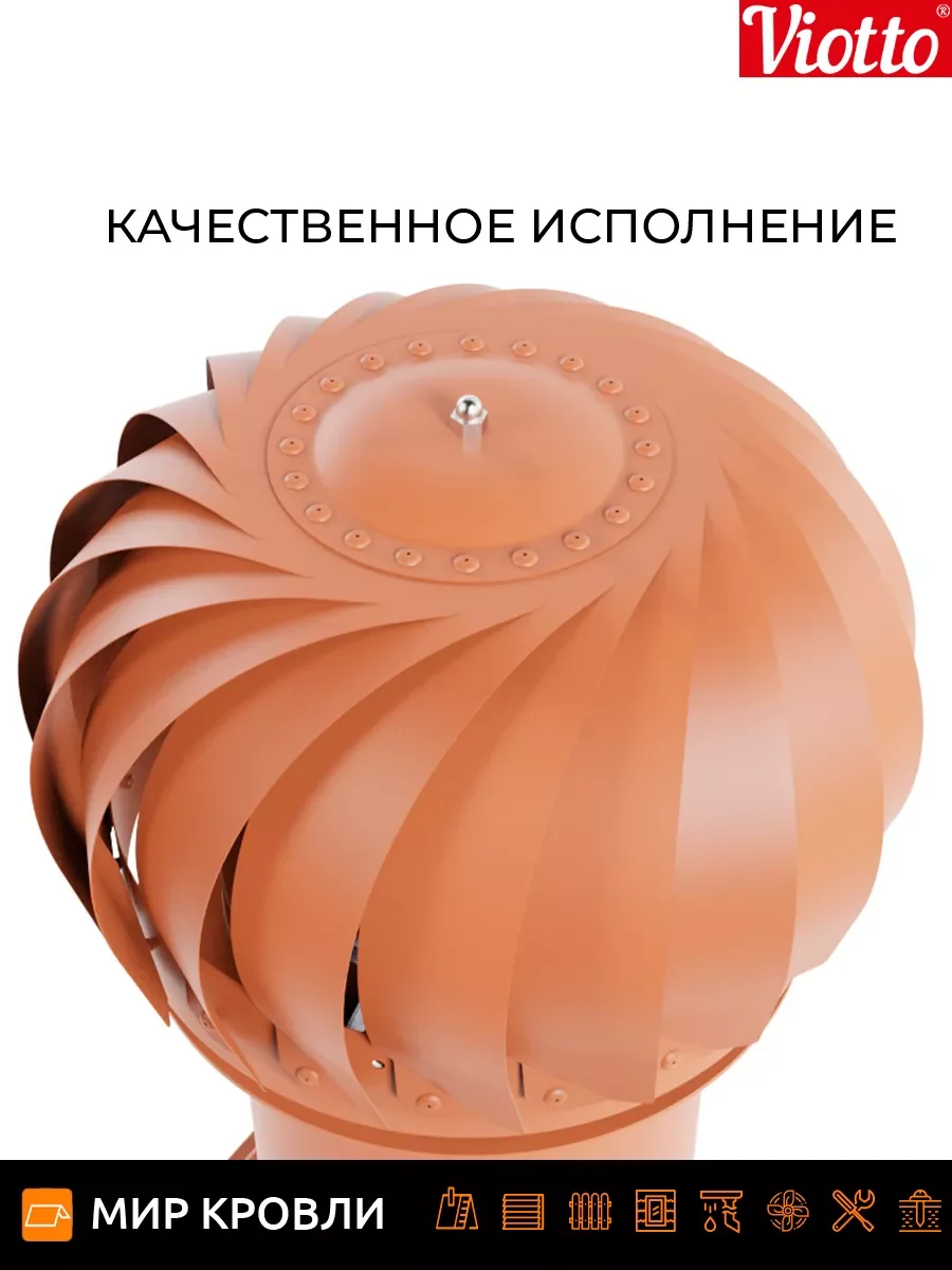 Роторная вентиляция работает без потребления электроэнергии. Используя энергию ветра, увеличивается циркуляцию воздуха, тем самым устройство эффективно вытягивает отработанный воздух из самых различных помещений. Технические характеристики Применяемая турбина оснащена лопастями геометрия которых увеличивает тягу за счет создания давления в вентиляционном канале, что предотвращает эффект обратной тяги На 30% эффективнее естественной вентиляции Ось вращения с заводской балансировкой обеспечивает равномерность и плавность вращения лопастей Узел вращения защищён от попадания влаги, позволяет эксплуатировать устройство от — 45 до + 80 градусов Диаметр трубы 110 мм/ 125 мм /150 мм, она может быть утепленной и не утепленной Есть возможность установки на готовую мягкую и фальцевую кровлю, металлочерепицу «Монтеррей», мягкую кровлю при монтаже, на профнастилы высотой 20 и 21мм. При использовании универсального проходного элемента подойдет на любой тип металлочерепицы и профнастил до 35 мм. Система уровня на шарнире, предоставляющая возможность точной и эргономичной установки.