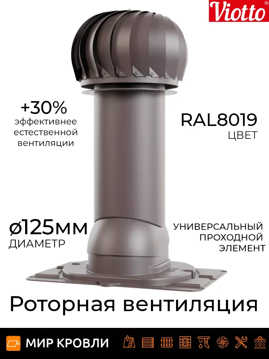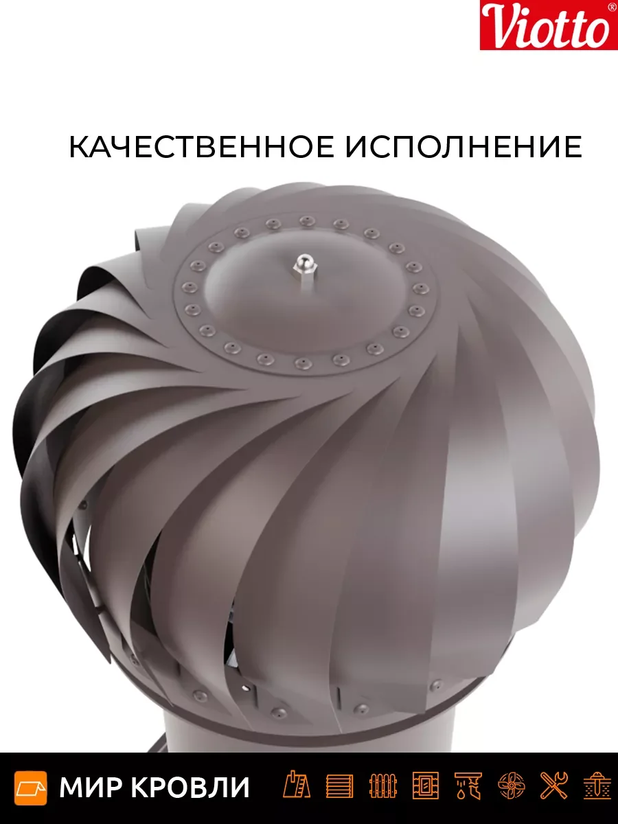 Роторная вентиляция работает без потребления электроэнергии. Используя энергию ветра, увеличивается циркуляцию воздуха, тем самым устройство эффективно вытягивает отработанный воздух из самых различных помещений. Технические характеристики Применяемая турбина оснащена лопастями геометрия которых увеличивает тягу за счет создания давления в вентиляционном канале, что предотвращает эффект обратной тяги На 30% эффективнее естественной вентиляции Ось вращения с заводской балансировкой обеспечивает равномерность и плавность вращения лопастей Узел вращения защищён от попадания влаги, позволяет эксплуатировать устройство от — 45 до + 80 градусов Диаметр трубы 110 мм/ 125 мм /150 мм, она может быть утепленной и не утепленной Есть возможность установки на готовую мягкую и фальцевую кровлю, металлочерепицу «Монтеррей», мягкую кровлю при монтаже, на профнастилы высотой 20 и 21мм. При использовании универсального проходного элемента подойдет на любой тип металлочерепицы и профнастил до 35 мм. Система уровня на шарнире, предоставляющая возможность точной и эргономичной установки.