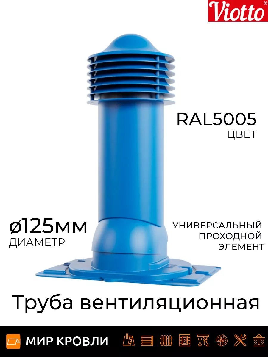 Обеспечивает приток свежего воздуха и правильную циркуляцию воздушных потоков в доме. Создает благоприятный микроклимат, обеспечивая правильный воздухообмен. Технические характеристики1. Есть возможность установки на готовую мягкую и фальцевую кровлю, металлочерепицу монтеррей, мягкую кровлю при монтаже, на профнастилы включая 35, на любой тип металлочерепицы.2. Состоит из основания (проходного элемента), трубы (с кольцами и колпаком) и гофры (для соединения с трубами вентиляции).3. Регулируемый уровень наклона от 5°С до 45°С4. Диаметр труб 110мм\высота 550мм, 125мм и 150мм\высота 650мм, она может быть утепленной и не утепленной.5. На колпаке имеется встроенный уровень для удобства выравнивания трубы на кровле.6. Форма кольца, предотвращающая попаданию дождевой воды внутрь