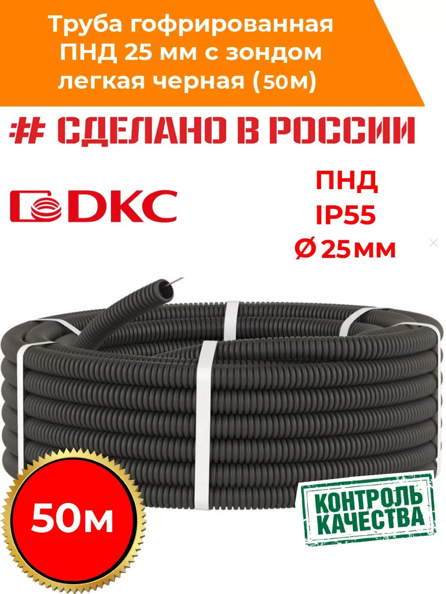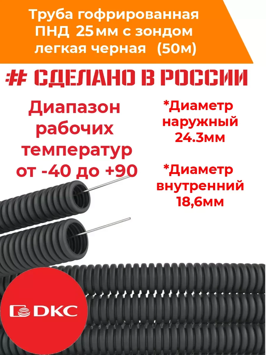 Труба гофрированная DKC ПНД 25мм, лёгкая с протяжкой 50 м. Применяется для прокладки в ней кабелей – электрических, телевизионных, компьютерных. Имеет небольшой вес и проволочную протяжку, которая делает прокладку кабеля в трубе проще. Гибкие гофрированные трубы легкой серии укладываются в штробы стен, стяжку полов (при этом их надо размещать на несгораемых основаниях), а также применяются в монолитном бетоностроении. Труба влагоустойчива и обеспечивает степень пыле- и влагозащиты до IP 55 (при использовании специальных аксессуаров). Материал – полиэтилен низкого давления (ПНД). Легкие гибкие гофрированные трубы имеют широкий диапазон температур монтажа и эксплуатации: - от -40 °С до +90 °С.