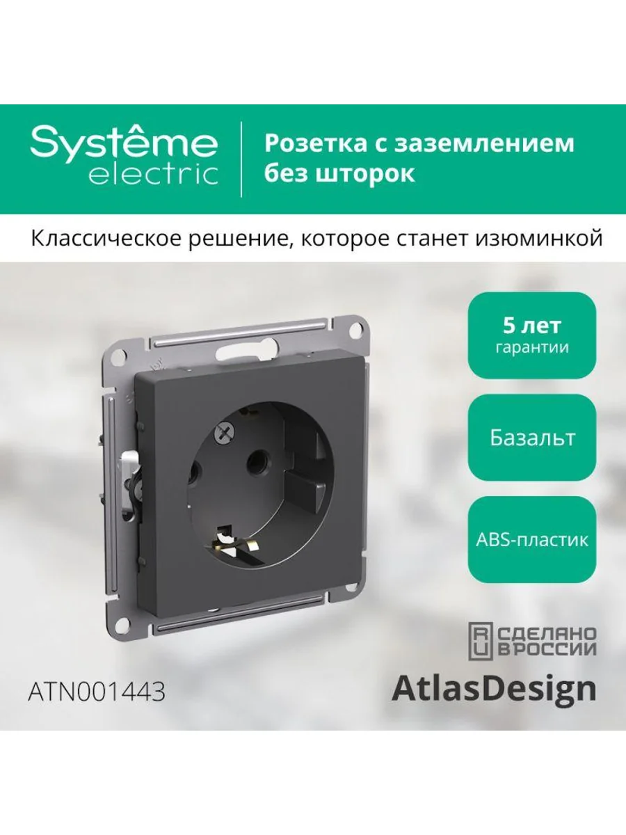 Механизм Systeme Electric (ранее Schneider Electric) серии AtlasDesign в цвете базальт розетки одинарной с заземлением и без шторок подходит для сетей 250 В, на ток 16 А. Заземляющий контакт обеспечивает дополнительную защиту от удара электрическим током. При наличии заземления электрический потенциал уходит в землю, защищая человека. Лицевые детали из качественного ABS-пластика, устойчивого к царапинам и УФ-излучению. Усиленные прямые монтажные лапки для лучшей фиксации механизма в монтажной коробке.