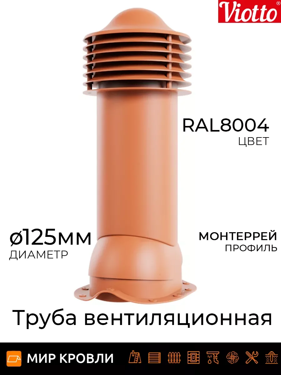 Обеспечивает приток свежего воздуха и правильную циркуляцию воздушных потоков в доме. Создает благоприятный микроклимат, обеспечивая правильный воздухообмен. Технические характеристики1. Есть возможность установки на готовую мягкую и фальцевую кровлю, металлочерепицу монтеррей, мягкую кровлю при монтаже, на профнастилы включая 35, на любой тип металлочерепицы.2. Состоит из основания (проходного элемента), трубы (с кольцами и колпаком) и гофры (для соединения с трубами вентиляции).3. Регулируемый уровень наклона от 5°С до 45°С4. Диаметр труб 110мм\высота 550мм, 125мм и 150мм\высота 650мм, она может быть утепленной и не утепленной.5. На колпаке имеется встроенный уровень для удобства выравнивания трубы на кровле.6. Форма кольца, предотвращающая попаданию дождевой воды внутрь