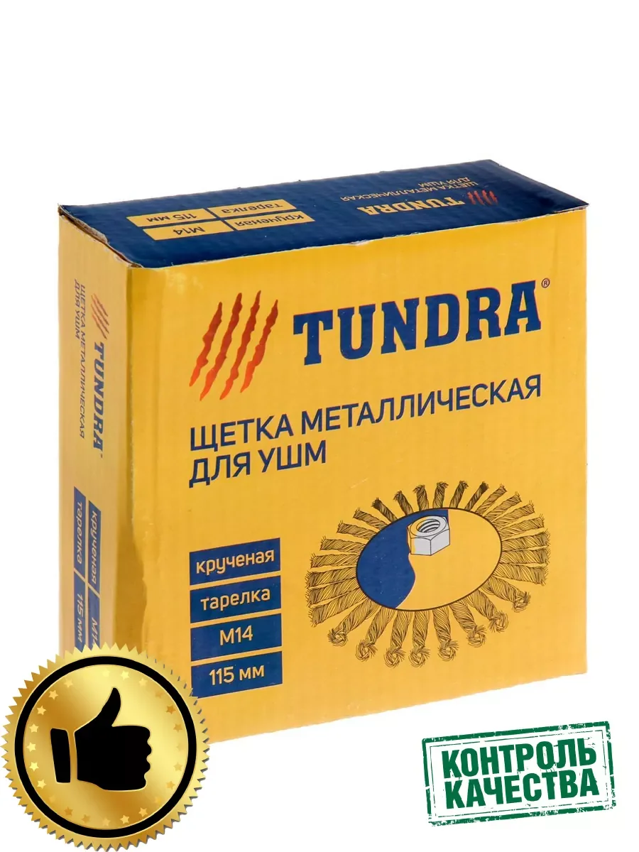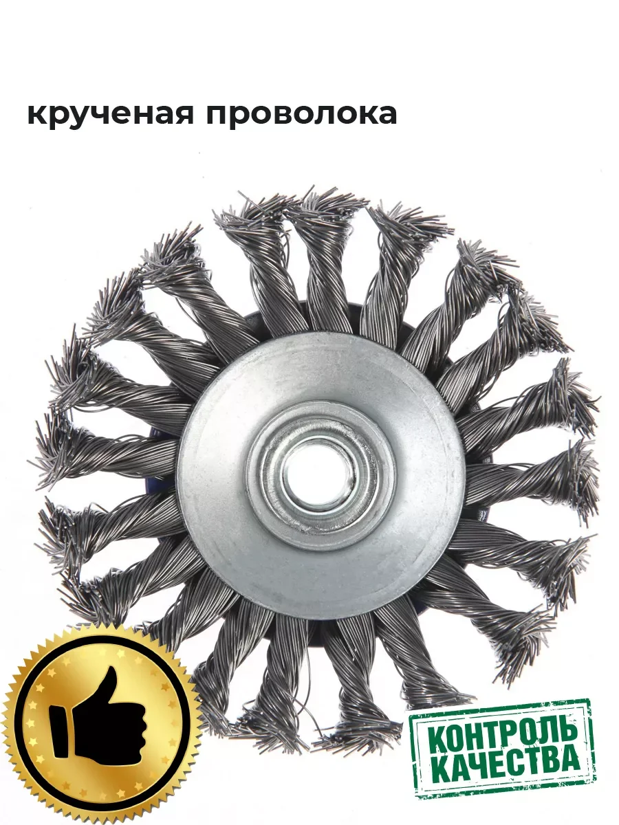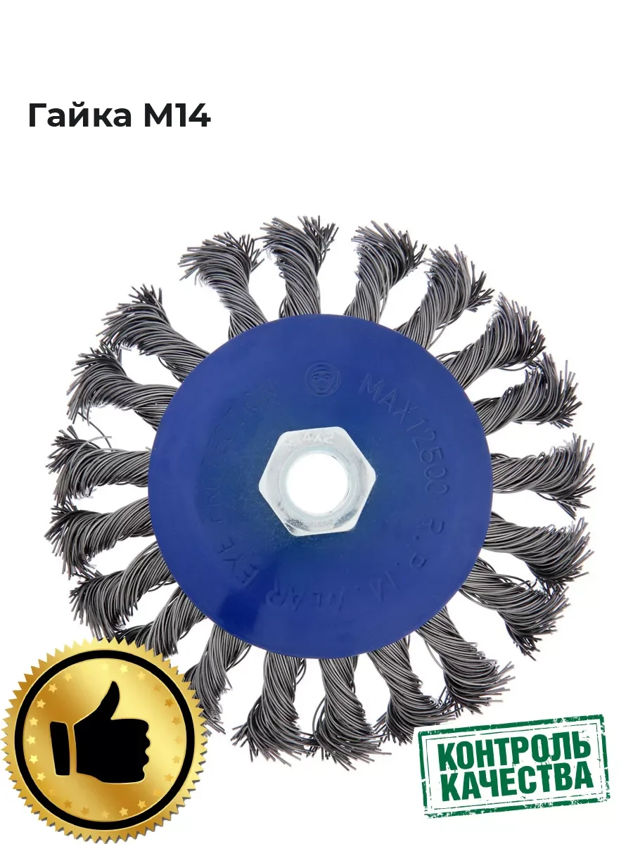 Металлическая кручёная щётка типа «тарелка» ТМ «TUNDRA» предназначена для грубой зачистки изделий из различных материалов, удаления ржавчины и грязи с металлических поверхностей. Применяется совместно с угловой шлифовальной машиной, тип крепления - М14. Щётка изготовлена из кручёной стальной проволоки с латунным покрытием, обладает высокой прочностью, не подвержена коррозии и окислению. Эргономичная форма рабочей части способствует снижению нагрузки на инструмент, что обеспечивает долгий срок службы и высокую эффективность работы.