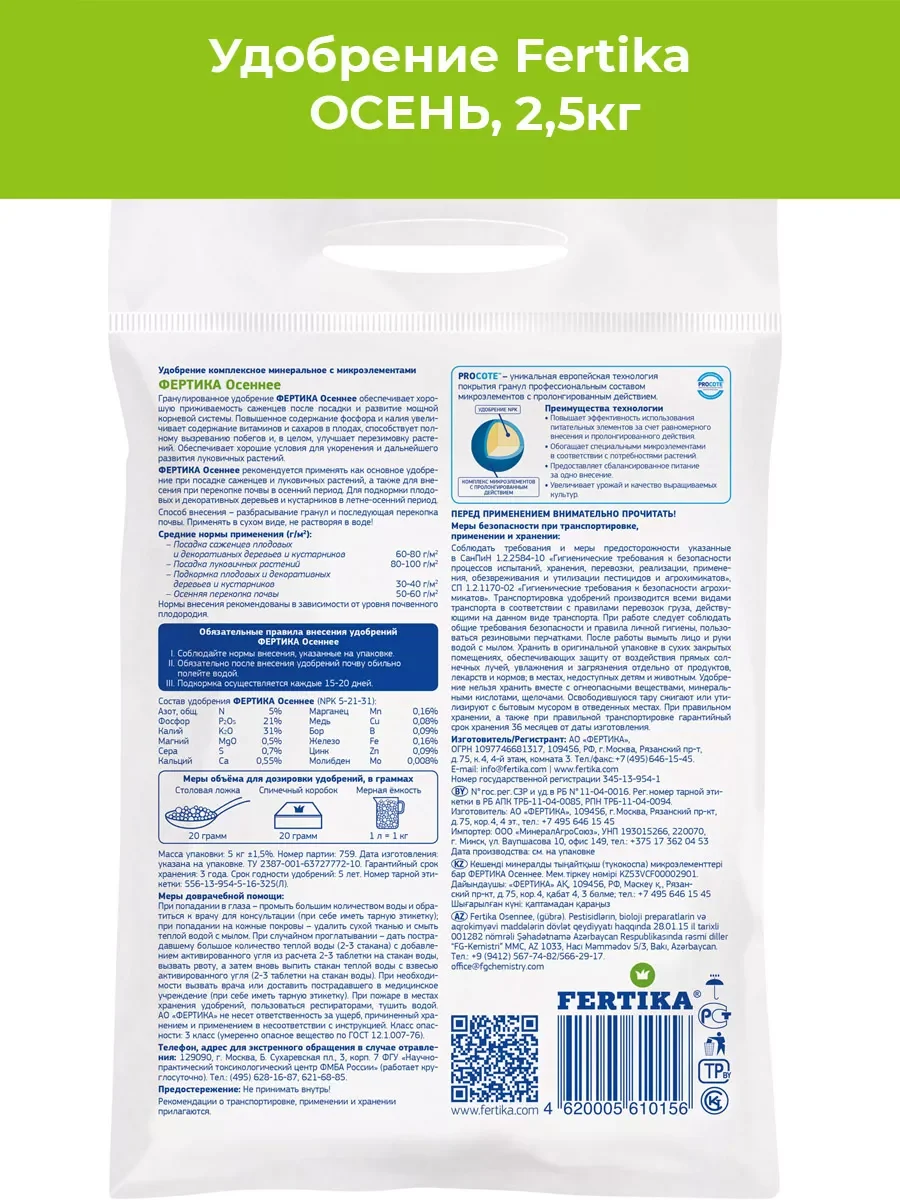 Удобрение Фертика Осеннее 1 кг содержит в своем составе много фосфора и калия, которые необходимы культурам осенью. Оно позволяет садоводам сохранить растения здоровыми и сильными, а также добиться хорошего цветения и плодоношения. Средство рекомендуется использовать в качестве корневой подкормки.Фертика Осеннее является минеральным комплексным гранулированным удобрением с полезными микроэлементами.Препарат применяется для следующих растений:- плодово-ягодные (земляника, крыжовник, клубника, яблоня, малина, груша, слива, голубика, вишня, черешня, виноград, алыча, ежевика, смородина, ирга, персик, жимолость);- цветы (рудбекии, розы, пионы, тюльпаны, астры, лилейник, бегонии, циннии, ипомеи, орхидеи, эхинацеи и другие);- декоративные цветущие кустарники (спирея, гортензия, вейгела, калина, буддлея, пузыреплодник, клематис, бересклет, чубушник, рододендрон).Удобрение воздействует на культуры следующим образом:- растения лучше приживаются на постоянном месте выращивания;- средство способно создавать благоприятные условия для скорого укоренения культуры и дальнейшего ее развития;- побеги полностью вызревают, растение лучше переносит зимний период;- плодовые почки развиваются лучше.