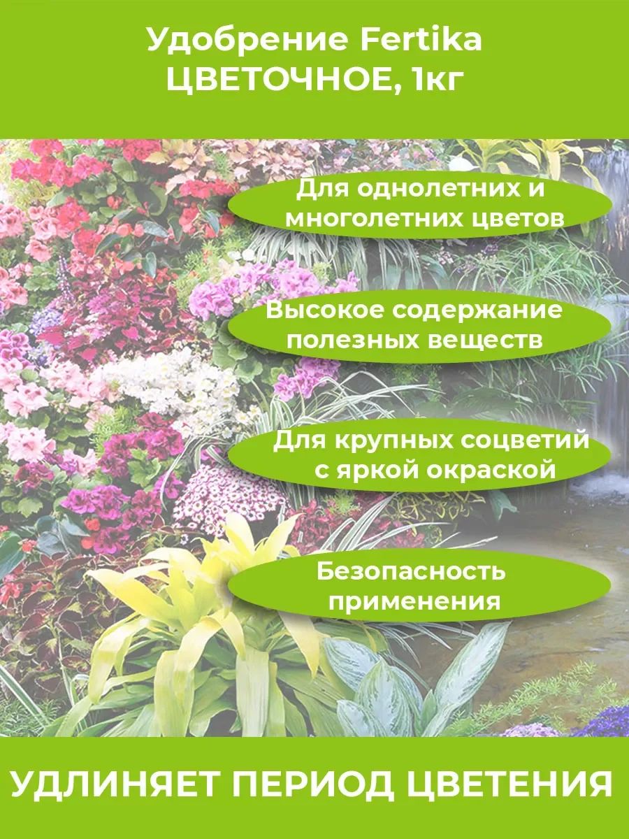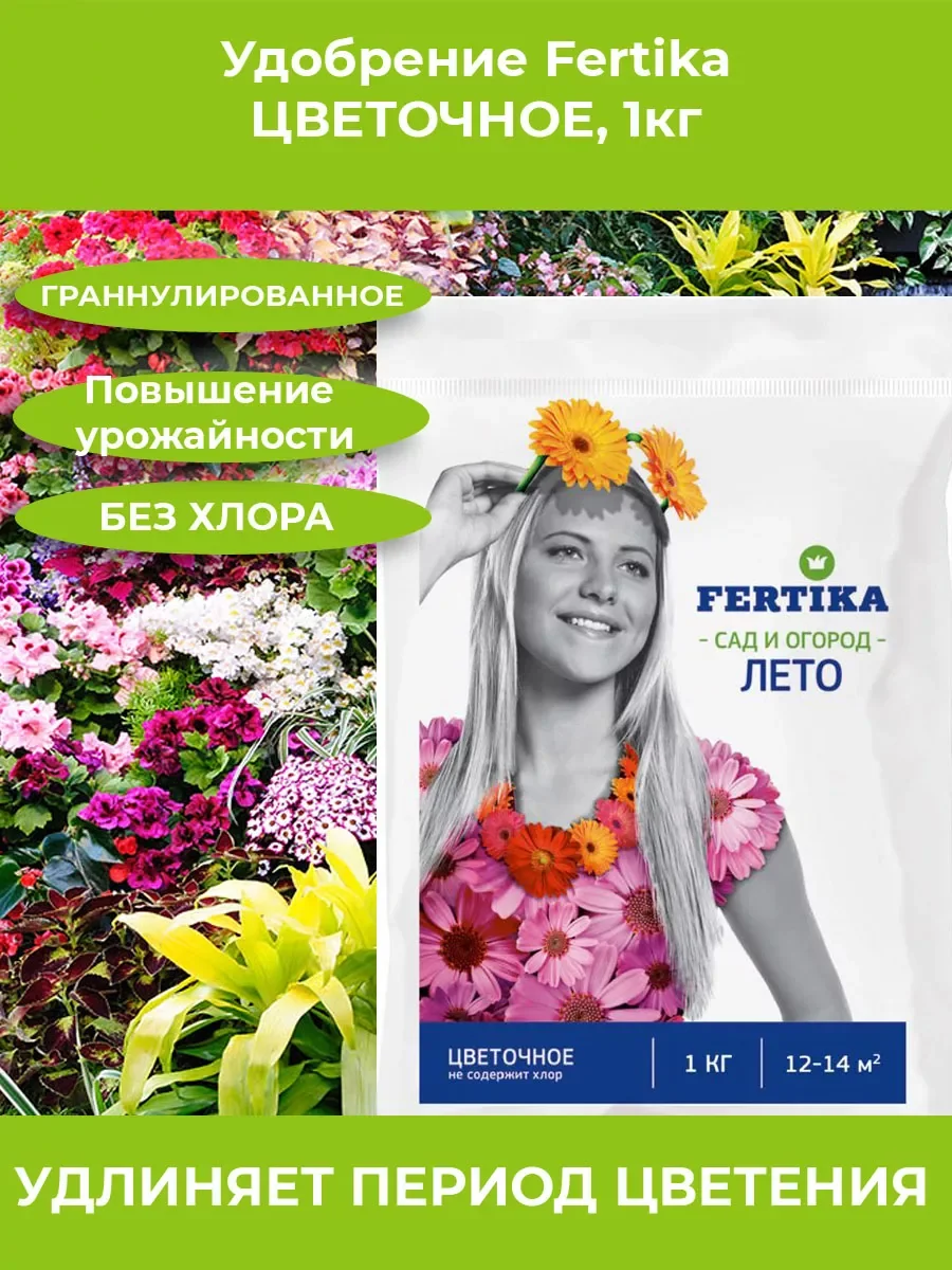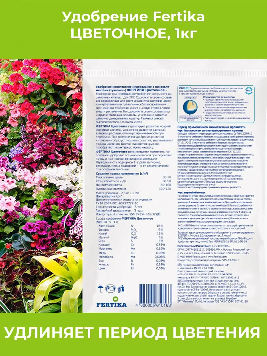 Комплексное гранулированное удобрение ФЕРТИКА / Fertika Цветочное Сад и огород Лето. Рекомендуется для однолетних и многолетних цветов, роз, клематисов, луковичных растений. Содержит все необходимые макро- и микроэлементы в оптимальном соотношении. Без хлора. Гарантирует развитие мощной корневой системы, ускоренное развитие растений в период рассады, отличную приживаемость при пересадке. При применении подкормки растения интенсивно образуют мощные соцветия, увеличивается период цветения. Цветки становятся крупнее, приобретают характерную яркую окраску. НОРМЫ И СПОСОБЫ ВНЕСЕНИЯ: В рассадную смесь добавляют 30-40 г удобрения на кв. м. Удобрение и смесь тщательно перемешивают, увлажняют и оставляют на 3-5 дней. При подготовке почвы весной удобрение равномерно распределяют по поверхности почвы, а затем перекапывают на нужную глубину. Внесенное удобрение не создает избыточной концентрации солей и стрессовой ситуации для молодых растений. Гранулы растворяются в почве постепенно, обеспечивая в течение длительного времени полноценное питание растений, а также способствуя интенсивному и продолжительному цветению. Для подкормки растений во время вегетации удобрение равномерно распределяют по поверхности почвы и аккуратно заделывают. После этого растения обильно поливают. Необходимо следить, чтобы гранулы не попадали на растения. Периодичность подкормок – 1-2 раза за период вегетации, норма подкормки – 1/2 от рекомендуемой. Фертика удобрение для садовых цветов, однолетних и многолетних, роз клематисов петуний флоксов пионов люпинов ирисов гвоздик лилий колокольчиков. Fertika подкормка для цветущих кустарников.