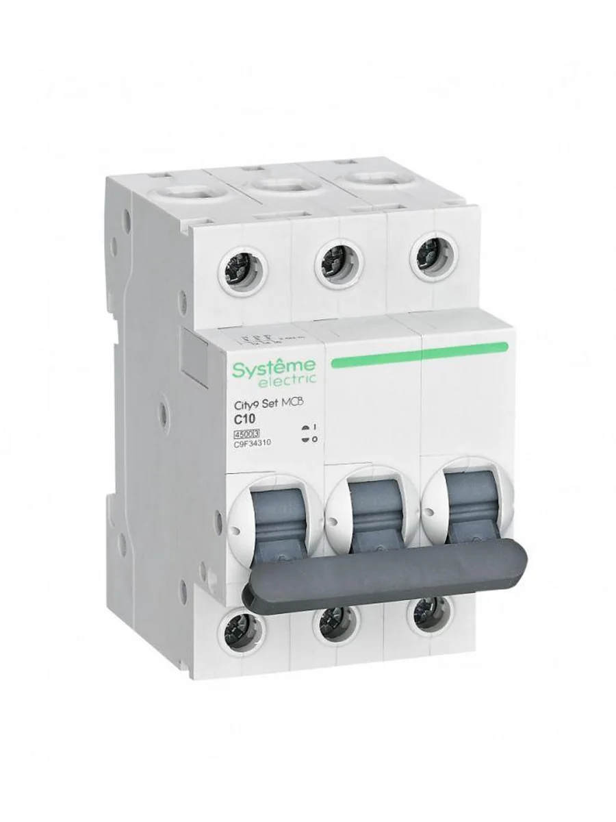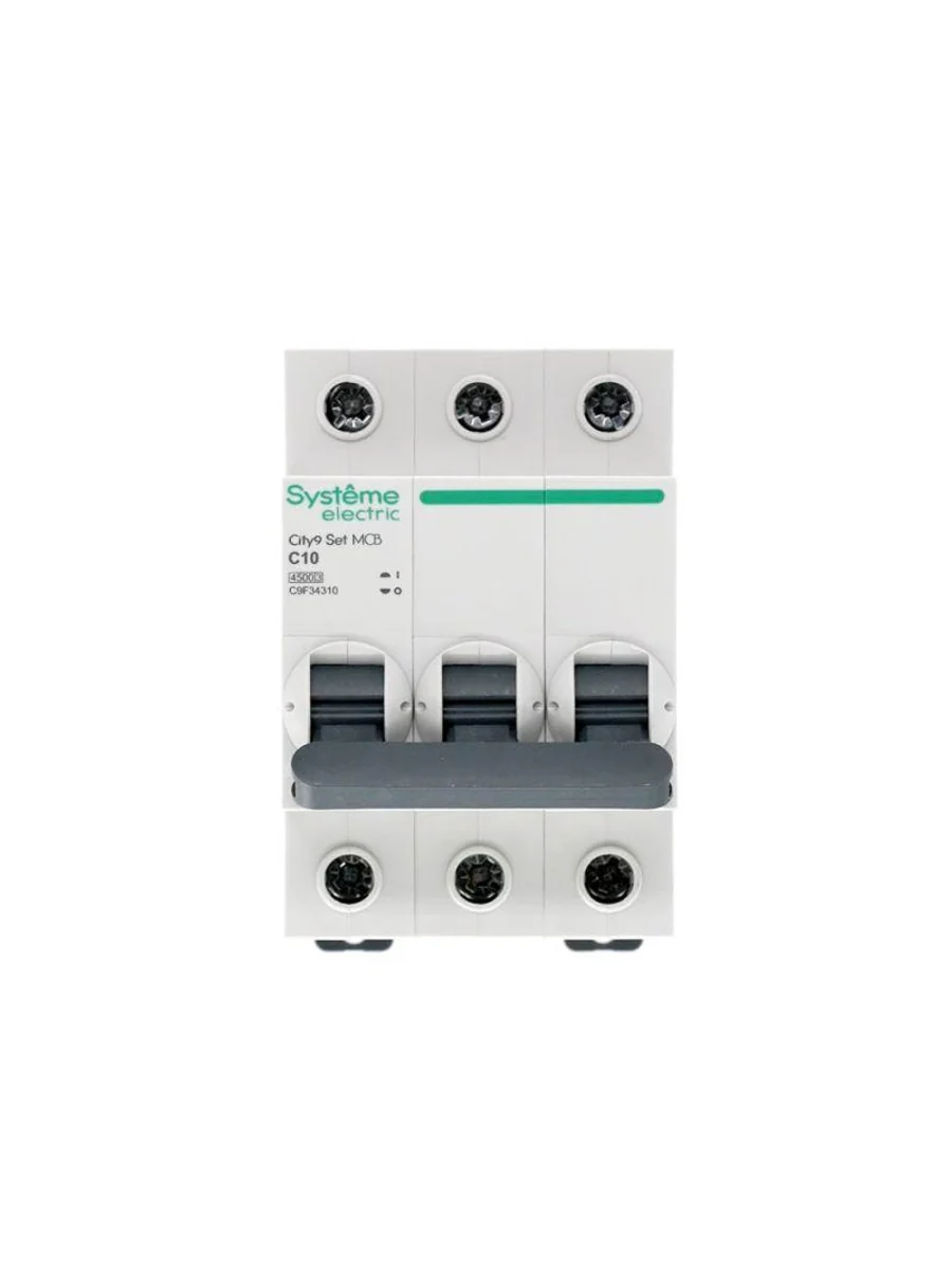 Автоматический выключатель серии City9 Set Systeme Electric, 3-полюсный, номинальный ток 10 А, характеристика С, Icn = 4.5 кА. Применяется в электрических сетях напряжением 400 В. Предназначен для защиты от перегрузок и токов короткого замыкания. Оснащен механизмом «мгновенной коммутации». Ударопрочный корпус из специального пластика с 6 металлическими заклепками. Безопасные клеммы исключают попадание кабелей в заклеммное пространство (ранее Schneider Electric EZ9F34310).