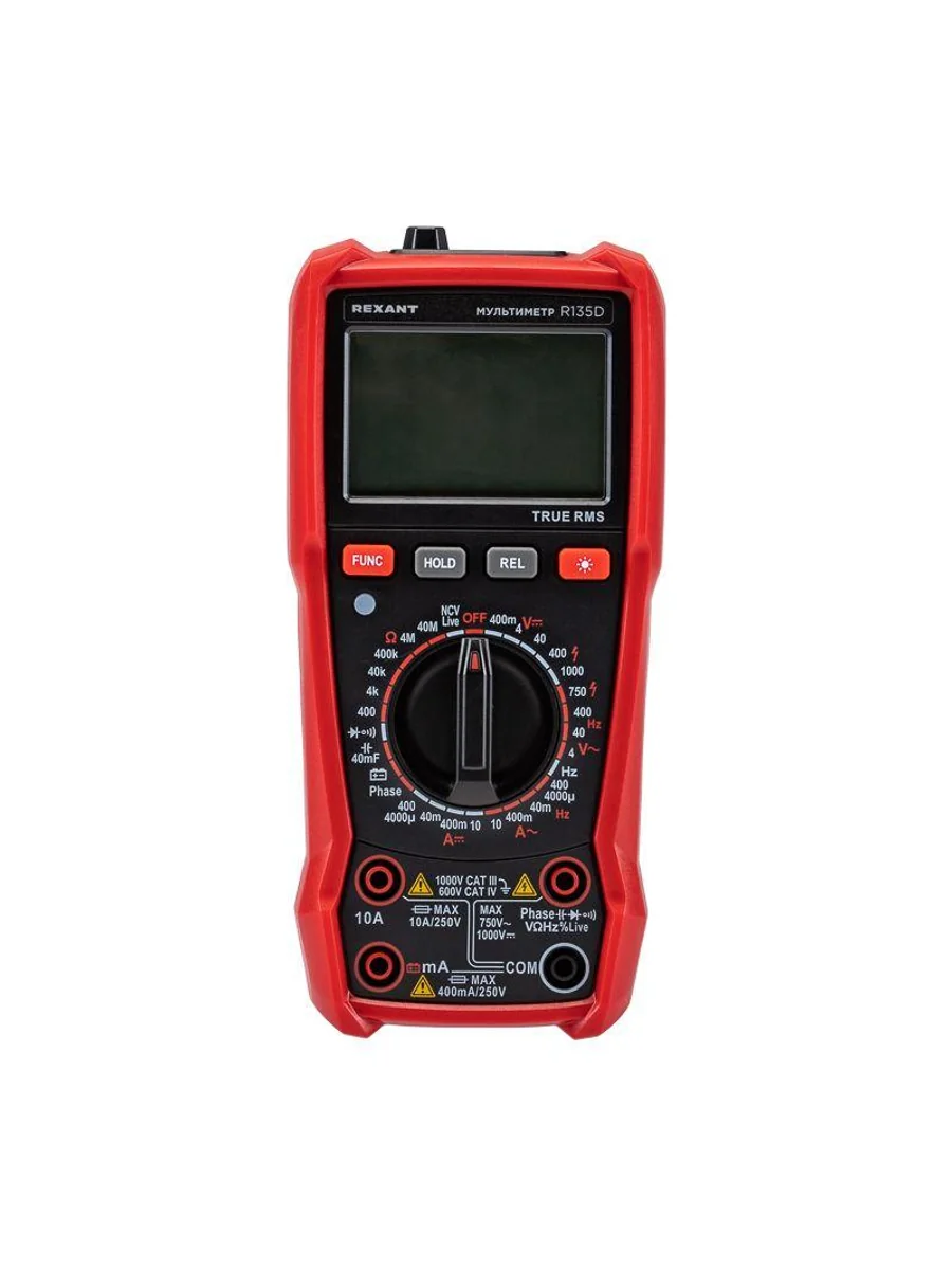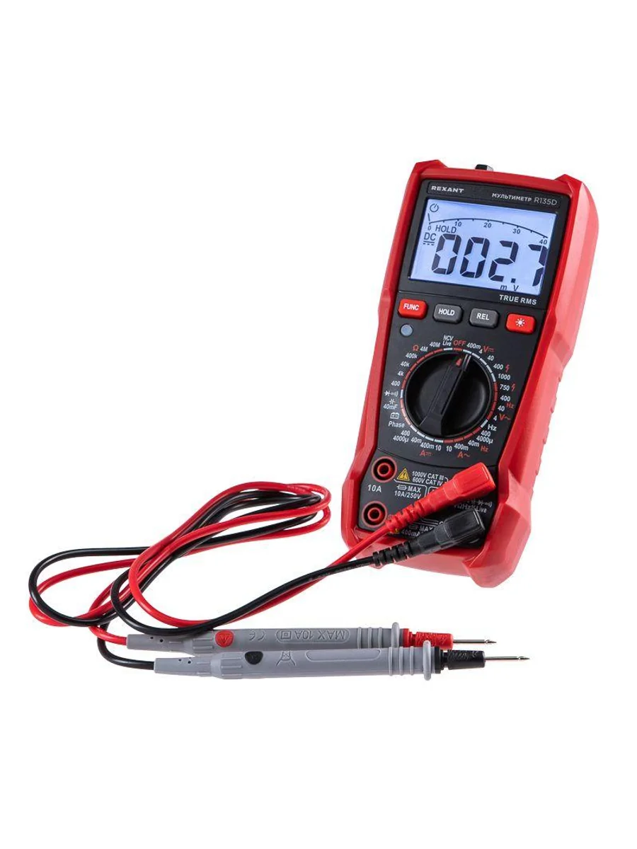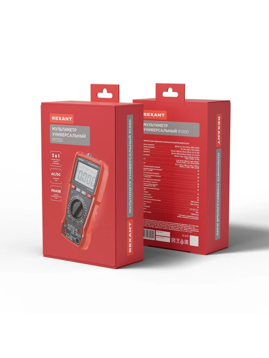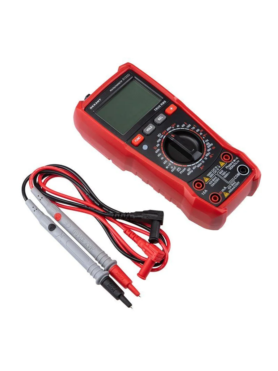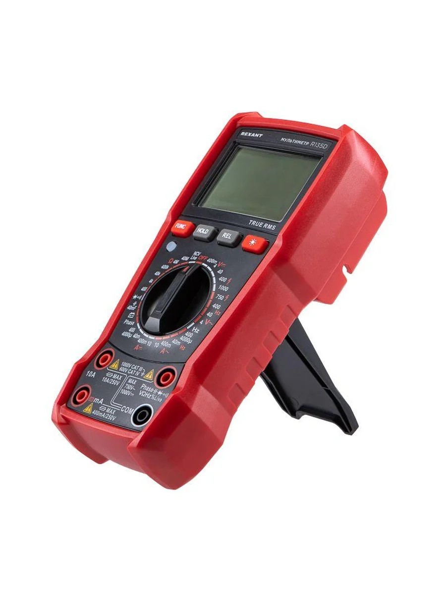 Многофункциональный цифровой мультиметр R135D REXANT сочетает высокую точность, удобство использования и широкий спектр функций. Прибор оснащен ручным выбором пределов измерений и большим дисплеем на 4000 разрядов. Среднеквадратичный метод измерения значений (True RMS) гарантирует точные результаты измерений. Графическая шкала выбора режима измерений упрощает процесс работы. Параметры измерений: Постоянное напряжение: 400мВ/4В/40В/400В/1000В ± (0.5%) Переменное напряжение: 4В/40В/400В/750В ± (8.0%) Постоянный/переменный ток: 400мкA/4000мкA /40мA/400мA/10A ± (1.2%/1.5%) Сопротивление: 400Ом/4кОм/40кОм/400кОм/4МОм/40MОм ± (1.5%) Емкость: 4нф/40нф/400нф/4мкф/40мкф/400мкф/4мф/40мф ± (5.0%) Частота: 4Гц/40Гц/400Гц/4кГц/40кГц/400кГц/4МГц ± (3.0%) Основные функции и особенности: Ручной выбор пределов измерений Среднеквадратичный метод измерения значений – True RMS Режим относительных измерений Бесконтактный детектор напряжения NCV с индикацией Функция памяти данных DATA HOLD Режим «прозвонка», диод- тест Световая и звуковая индикация нейтрали/фазы (LIVE TEST) Определение последовательности трех фаз Тест батарей Аналоговая шкала Разрядность дисплея: 4000 отсчетов Количество измерений в секунду: 3 Автоматическое отключение питания через 15 минут Батареи: 1,5 В ААА, 3 шт. Вес с батареями: 260 г Габариты: 179х83х53 мм Комплект поставки: мультиметр, измерительные щупы, батареи, инструкция