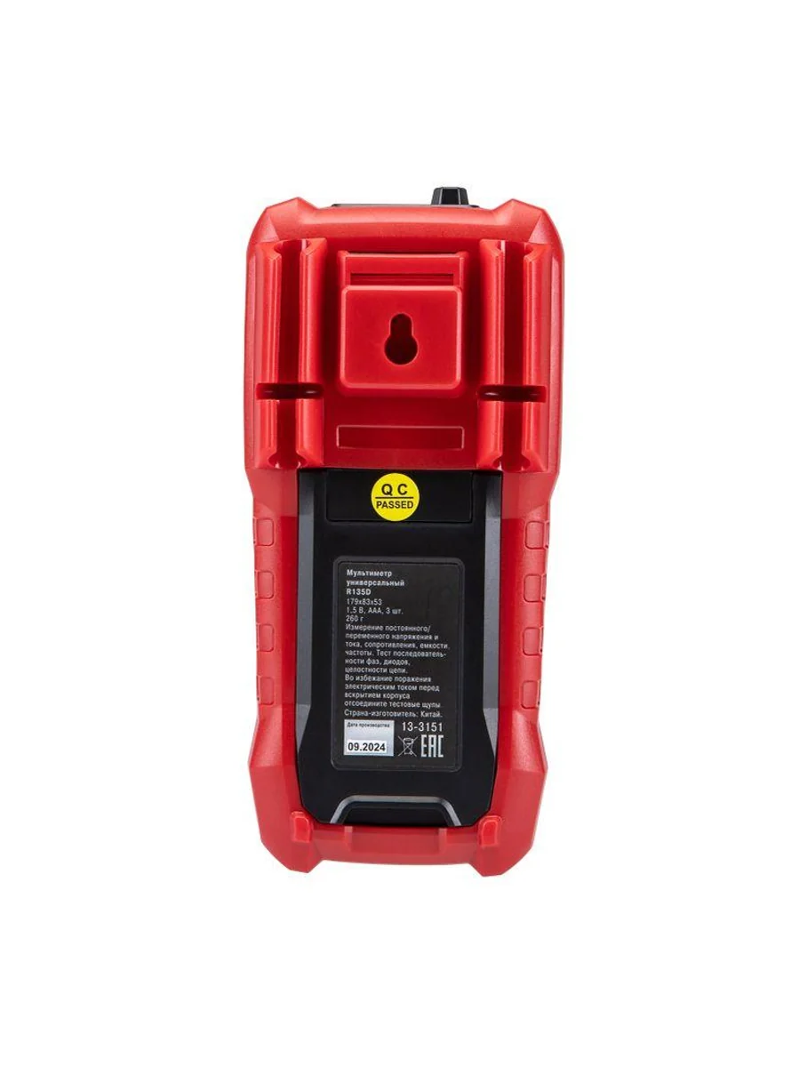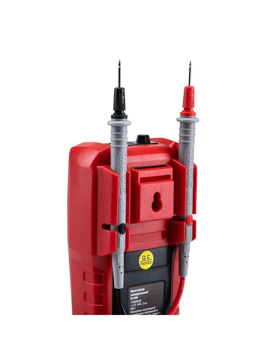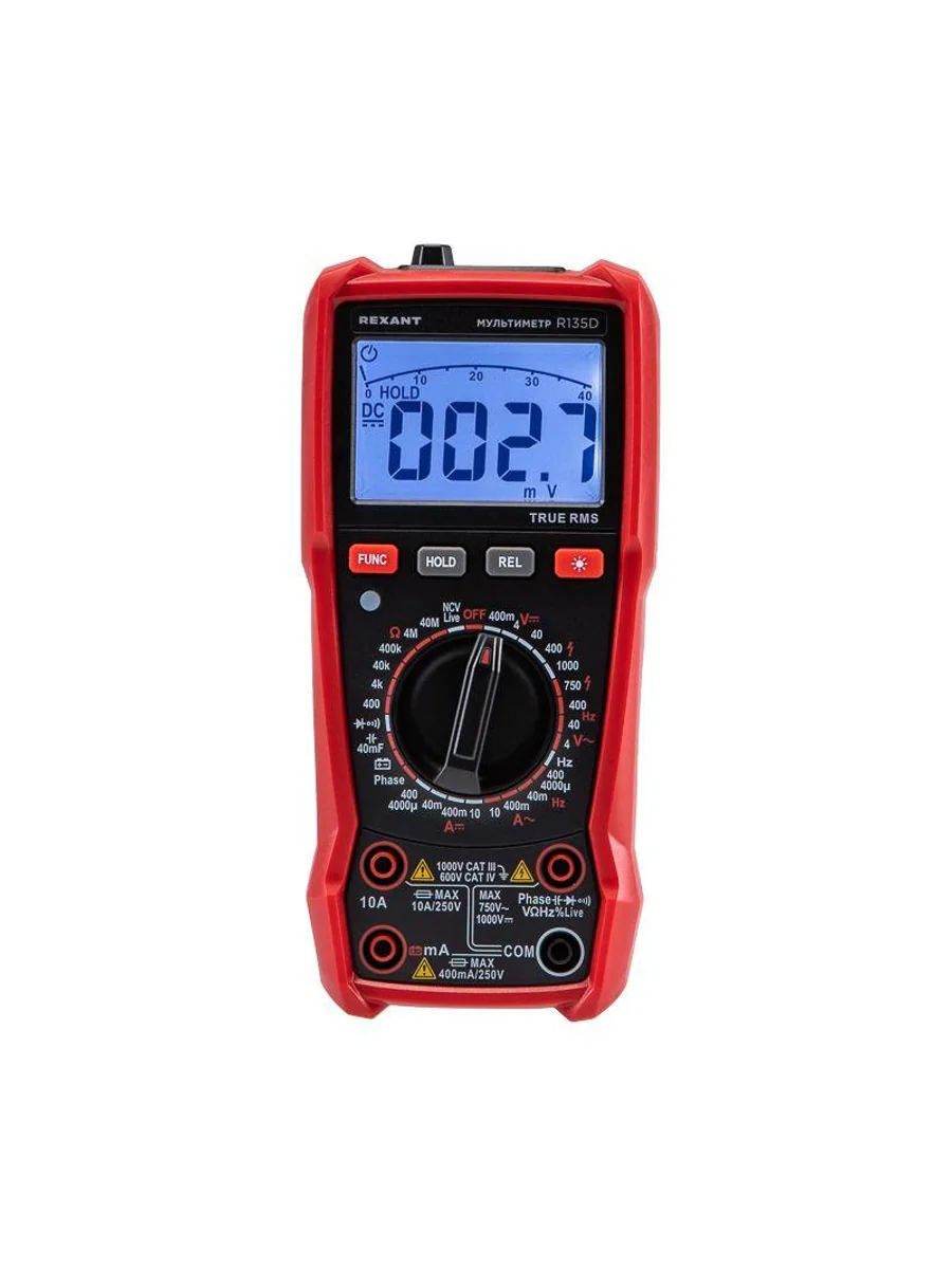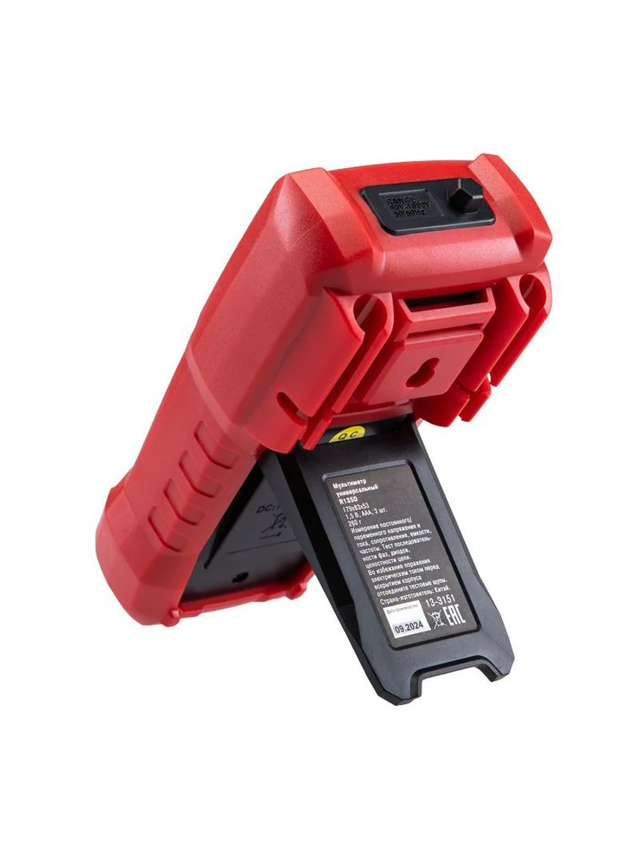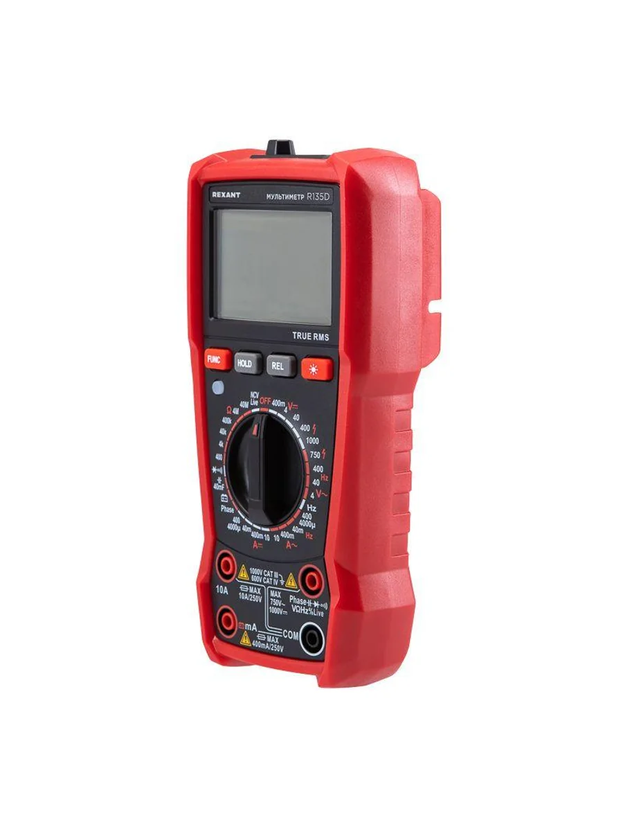 Многофункциональный цифровой мультиметр R135D REXANT сочетает высокую точность, удобство использования и широкий спектр функций. Прибор оснащен ручным выбором пределов измерений и большим дисплеем на 4000 разрядов. Среднеквадратичный метод измерения значений (True RMS) гарантирует точные результаты измерений. Графическая шкала выбора режима измерений упрощает процесс работы. Параметры измерений: Постоянное напряжение: 400мВ/4В/40В/400В/1000В ± (0.5%) Переменное напряжение: 4В/40В/400В/750В ± (8.0%) Постоянный/переменный ток: 400мкA/4000мкA /40мA/400мA/10A ± (1.2%/1.5%) Сопротивление: 400Ом/4кОм/40кОм/400кОм/4МОм/40MОм ± (1.5%) Емкость: 4нф/40нф/400нф/4мкф/40мкф/400мкф/4мф/40мф ± (5.0%) Частота: 4Гц/40Гц/400Гц/4кГц/40кГц/400кГц/4МГц ± (3.0%) Основные функции и особенности: Ручной выбор пределов измерений Среднеквадратичный метод измерения значений – True RMS Режим относительных измерений Бесконтактный детектор напряжения NCV с индикацией Функция памяти данных DATA HOLD Режим «прозвонка», диод- тест Световая и звуковая индикация нейтрали/фазы (LIVE TEST) Определение последовательности трех фаз Тест батарей Аналоговая шкала Разрядность дисплея: 4000 отсчетов Количество измерений в секунду: 3 Автоматическое отключение питания через 15 минут Батареи: 1,5 В ААА, 3 шт. Вес с батареями: 260 г Габариты: 179х83х53 мм Комплект поставки: мультиметр, измерительные щупы, батареи, инструкция